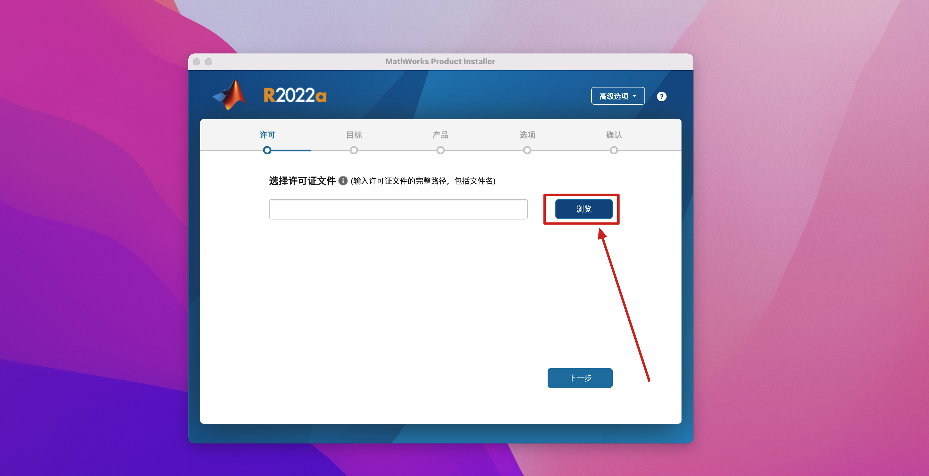 2.弹出一个MATLAB R2022安装程序,在高级选项里选择我有文件安装密钥