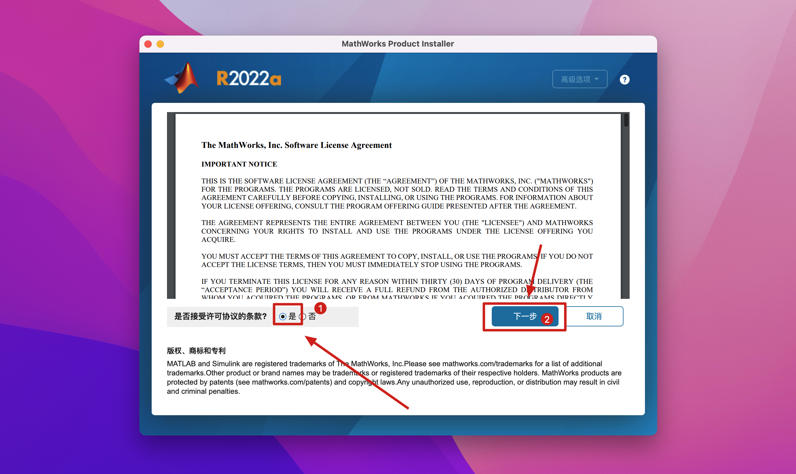3.出现协议条款,那就选择是,同意MATLAB R2022 a 协议,点击下一步