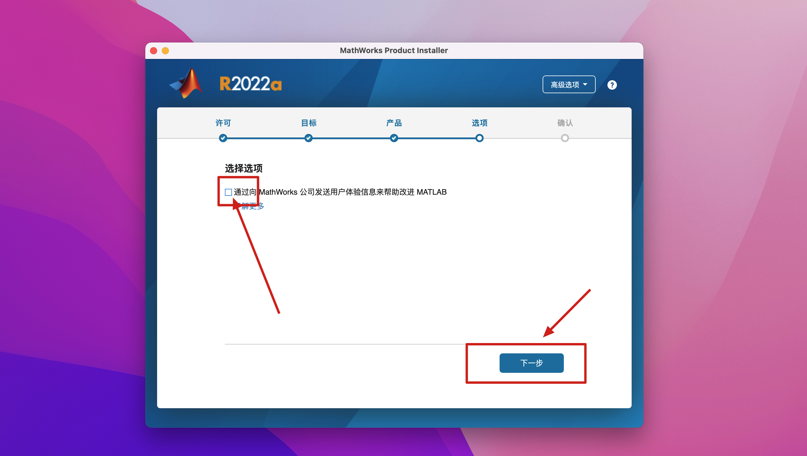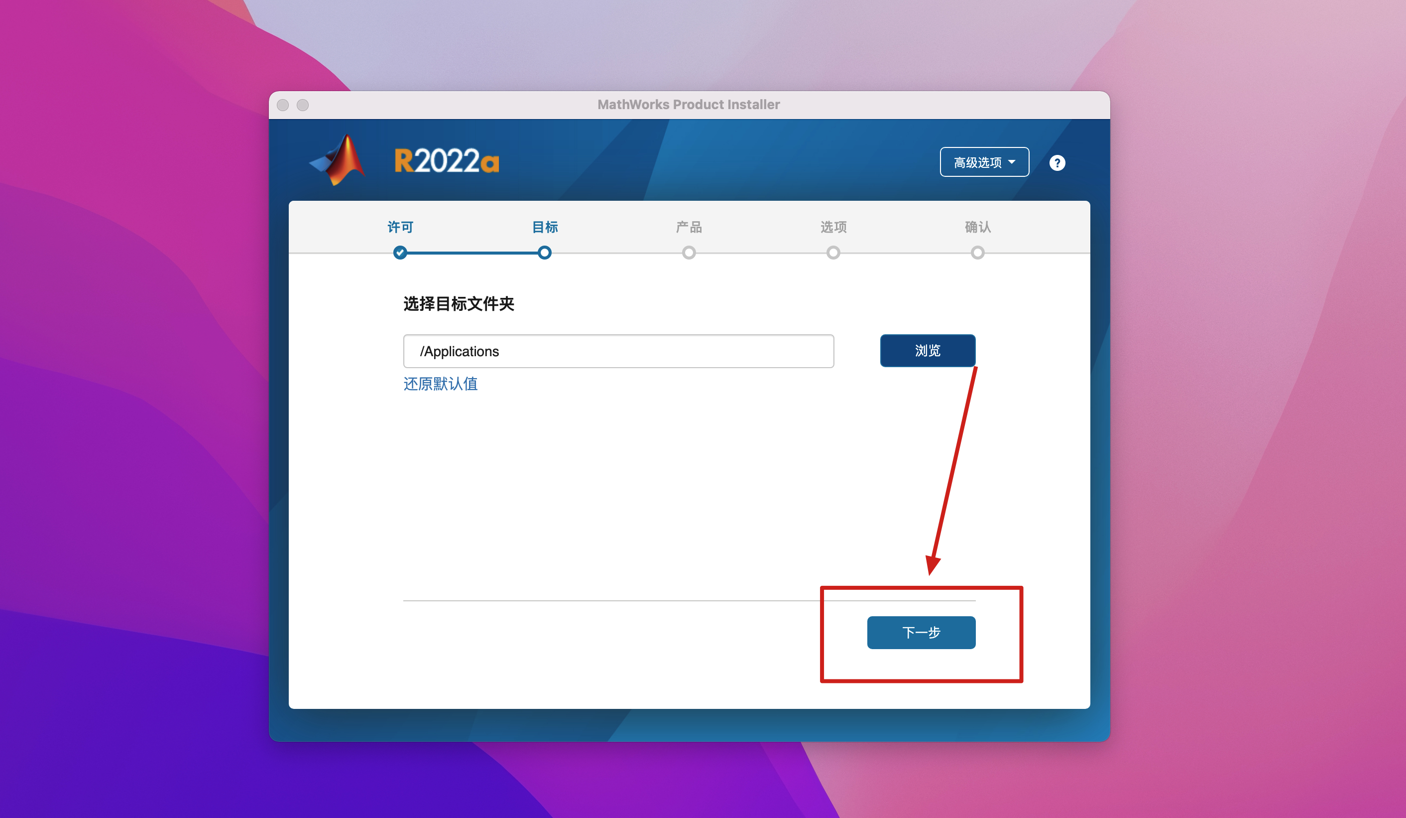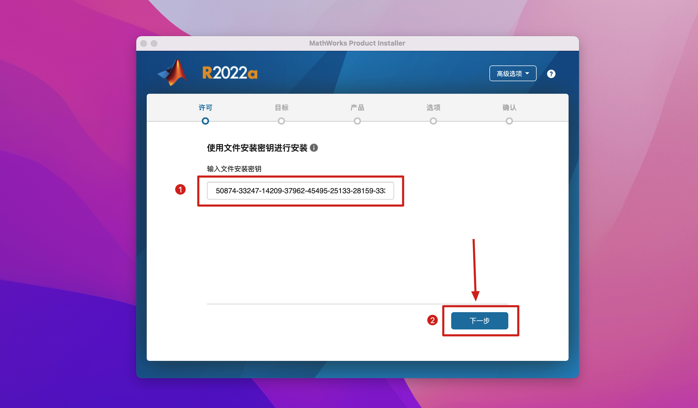 2.弹出一个MATLAB R2022安装程序,在高级选项里选择我有文件安装密钥