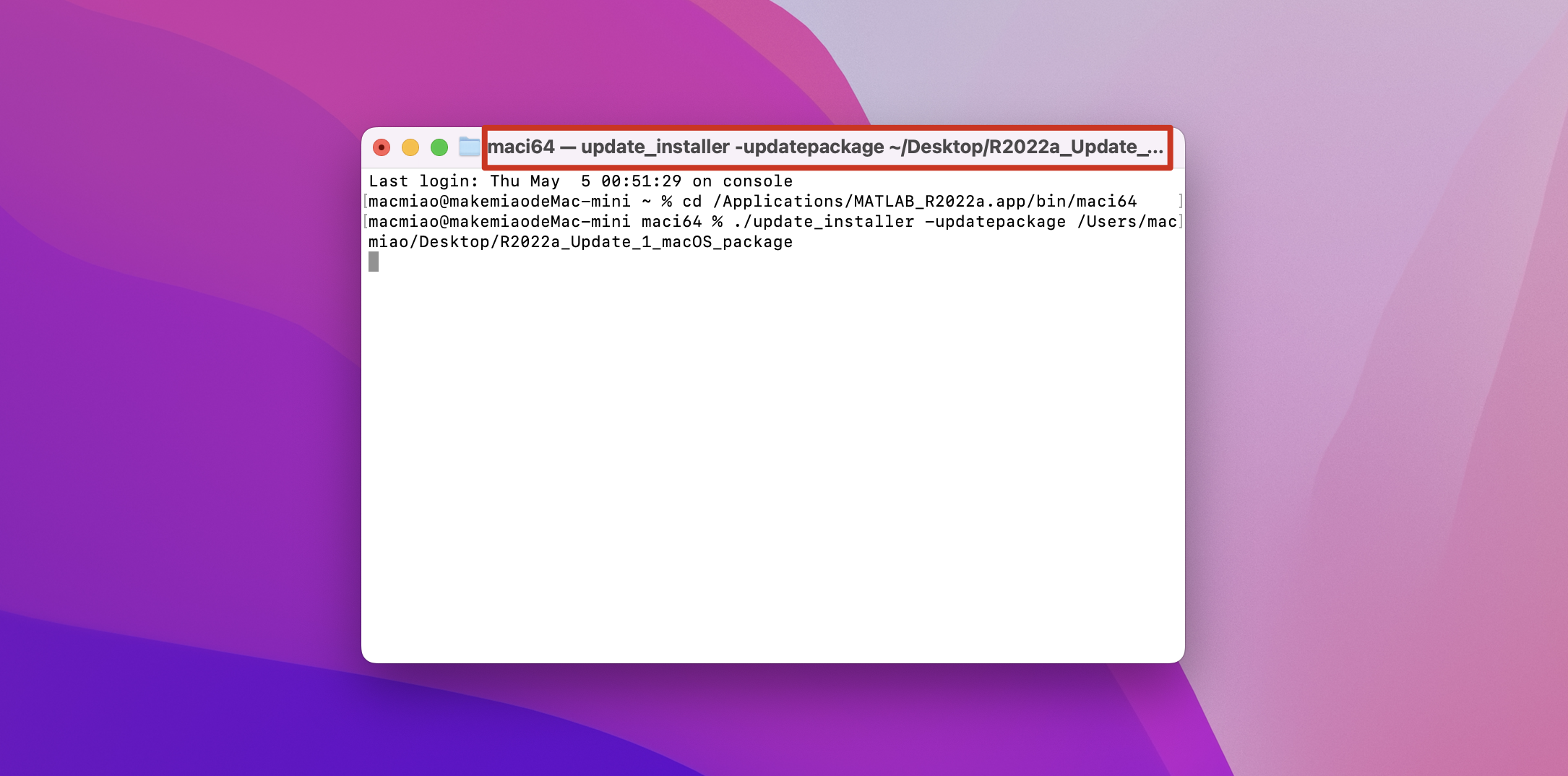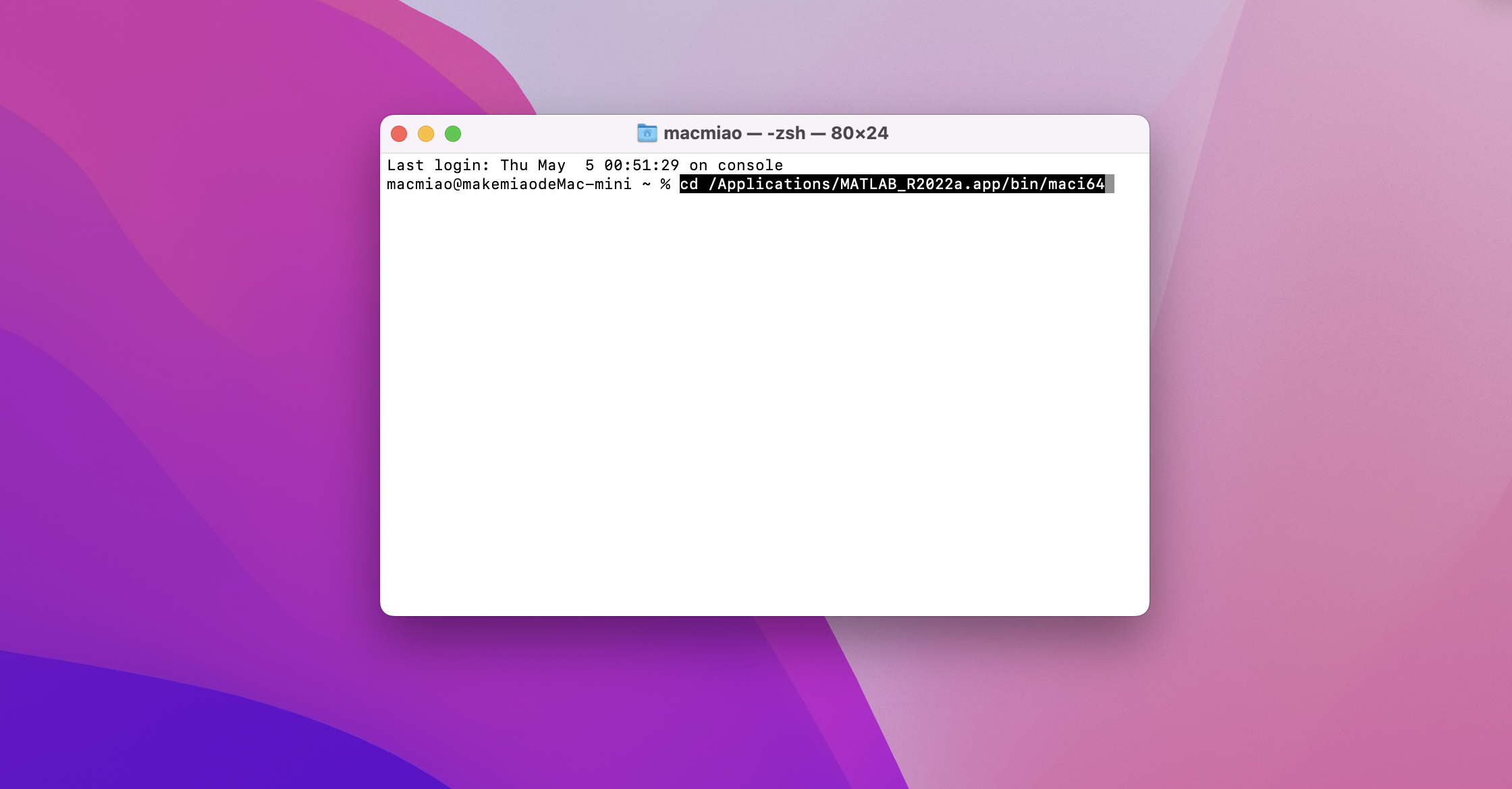 2.关闭打开的MATLAB,运行终端,复制cd /Applications/MATLAB_R2022a.app/bin/maci64然后回车