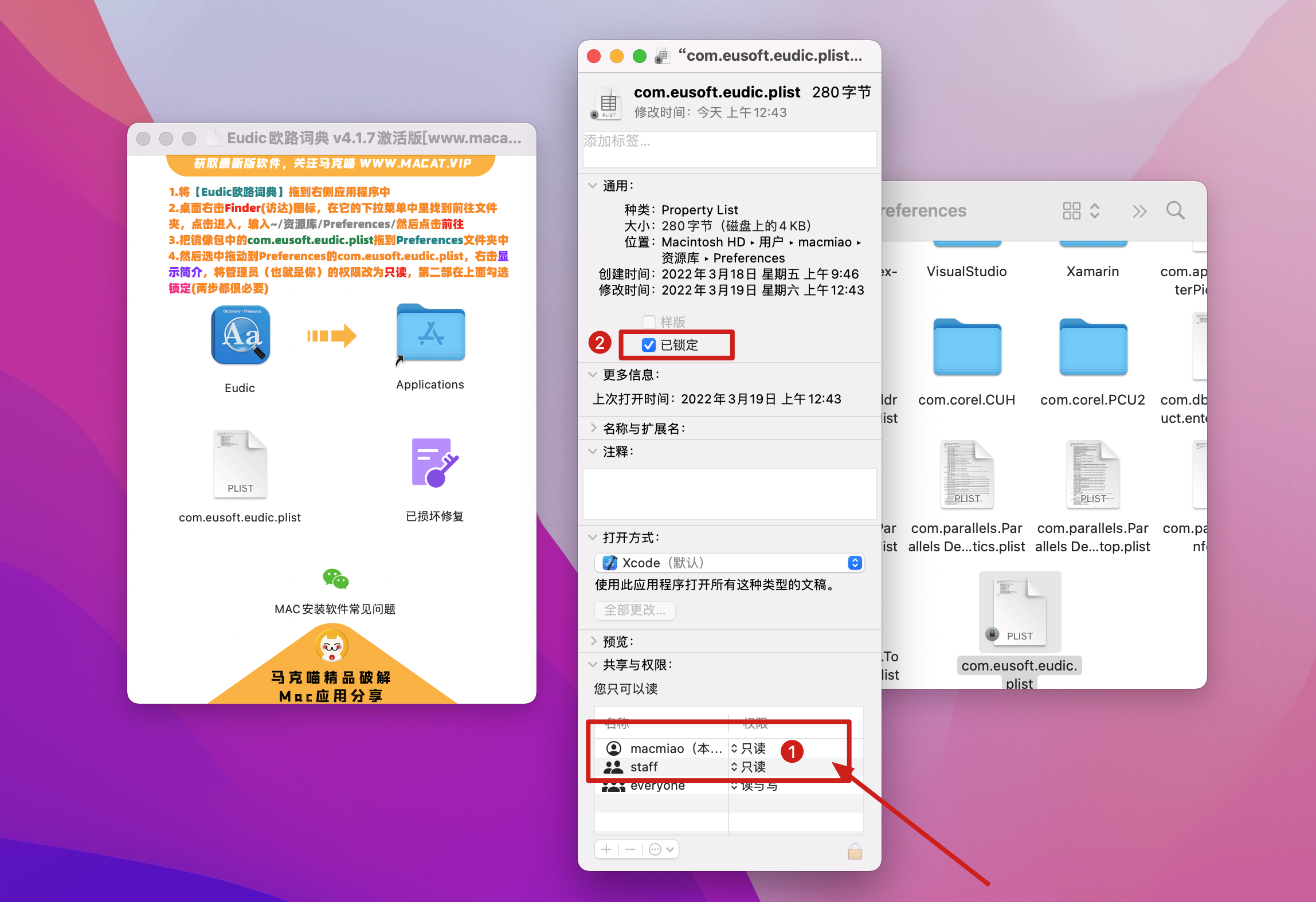 4.然后选中拖动到Preferences的com.eusoft.eudic.plist,右击显示简介,将管理员(也就是你)的权限改为只读,第二部在上面勾选锁定(两步都很必要)
