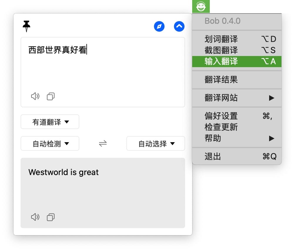 Bob 是一款 Mac 端翻译软件,支持划词翻译截图翻译,当然,手动输入进行翻译也是可以的。