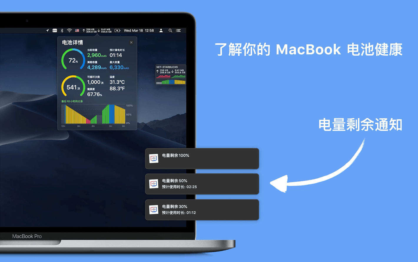 了解你的 MacBook 的电池健康和状态: 电量百分比、容量、可用时长、循环次数、健康程度、温度和电量图等。通过及时掌握你的 Mac 电池状况,从而延长使用寿命。