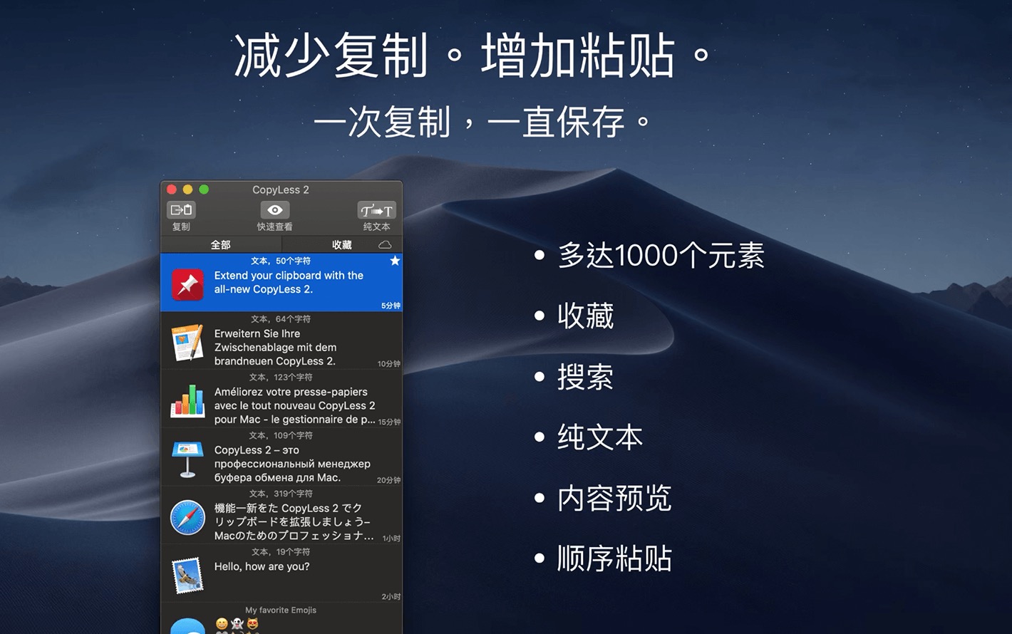 搜集到的CopyLess 2 For Mac是一款专业剪贴板管理器,它能扩展您的剪贴板。全面升级,完全重新设计,重新以Swift代码执行,只为更好的性能、稳定性、舒适性。