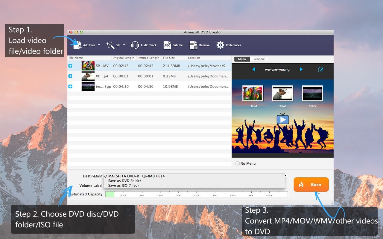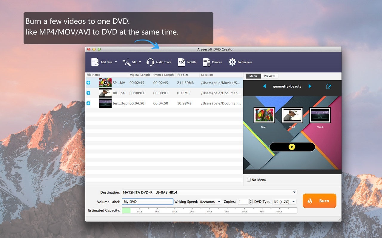 Aiseesoft DVD Creator for mac 可以在macOS High Sierra上刻录DVD无论您是从YouTube,Dailtmotion,Vevo等在线网站下载视频,还是从您的MP4播放器,iMovie,Apple设备(iPhone,iPad,Macbook Pro),Sony数码相机,Panosonia摄像机等获取家庭电影,都可以使用此软件在Mac上轻松创建DVD并支持最新的macOS High Sierra。