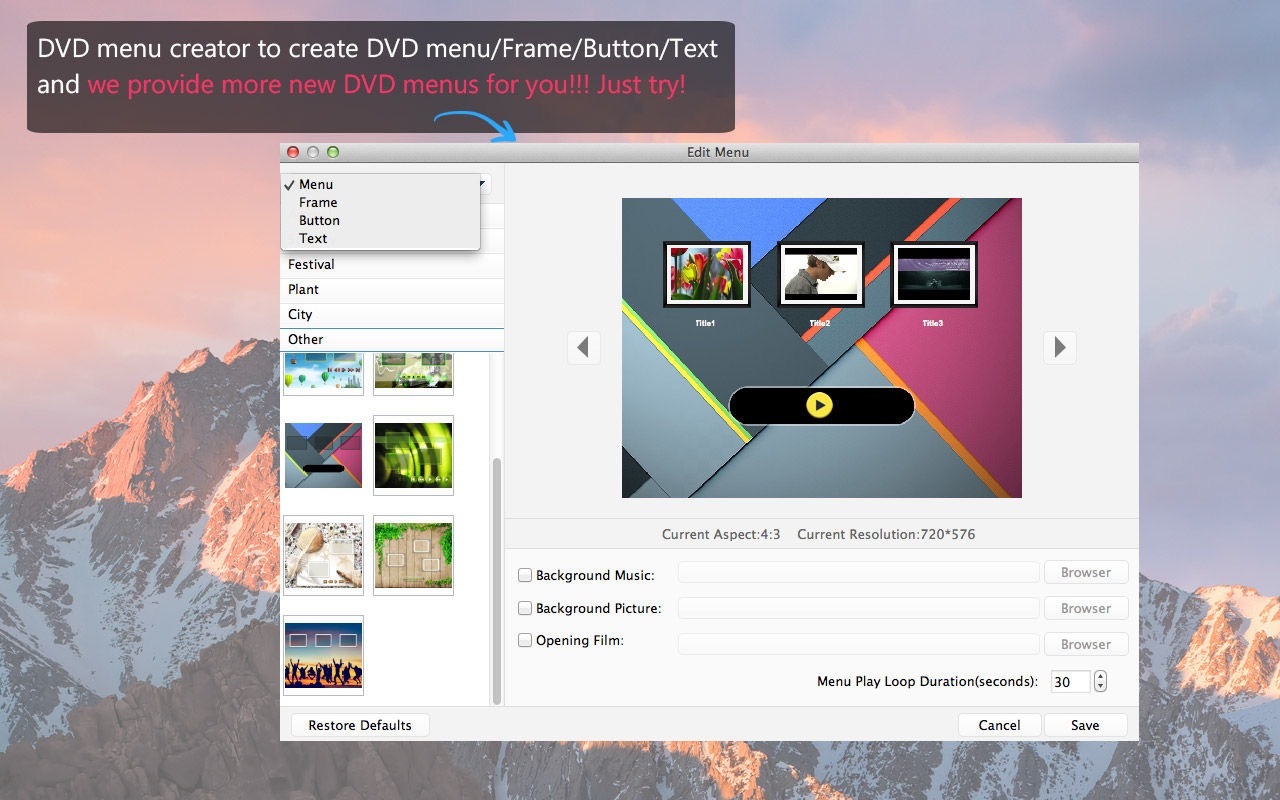 这DVD刻录软件带有数十个可选的DVD菜单模板,如动物,城市,节日,植物,风景等。或者,如果您愿意,可以完全省略菜单。