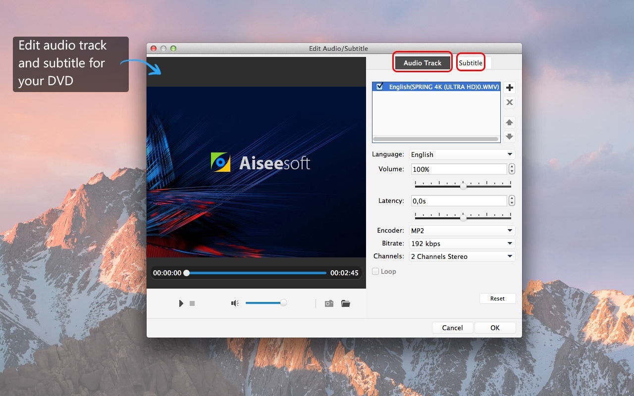 这款适用于Mac的DVD制作软件使您能够为视频文件添加多个音轨,从而允许您为最终产品添加其他语言或声音。字幕也可以合并到您的视频文件中。此功能的选项包括选择用于签名音轨和字幕的语言,调整字幕位置,字体,大小或颜色以及音轨音量的能力,以及音频编码器/比特率/通道的选择。