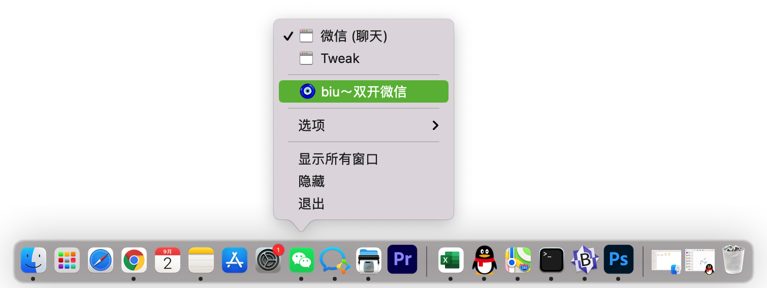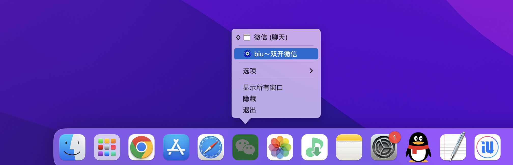 安装 Tweak 后,在程序坞的微信图标上单击右键,就可以登录另一个微信,支持无限多开。 - 免二次认证登录