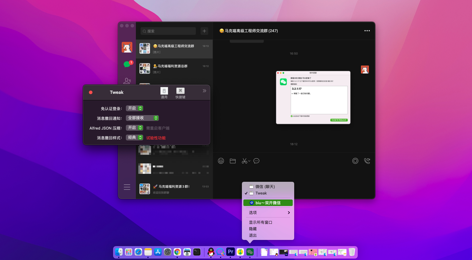 微信内置小助手Tweak稳定版,它能极大丰富你的mac版微信的功能,将官方没有的功能通过插件的形式实现。安装微信小助手后,在微信的偏好设置里可以看到各项功能。