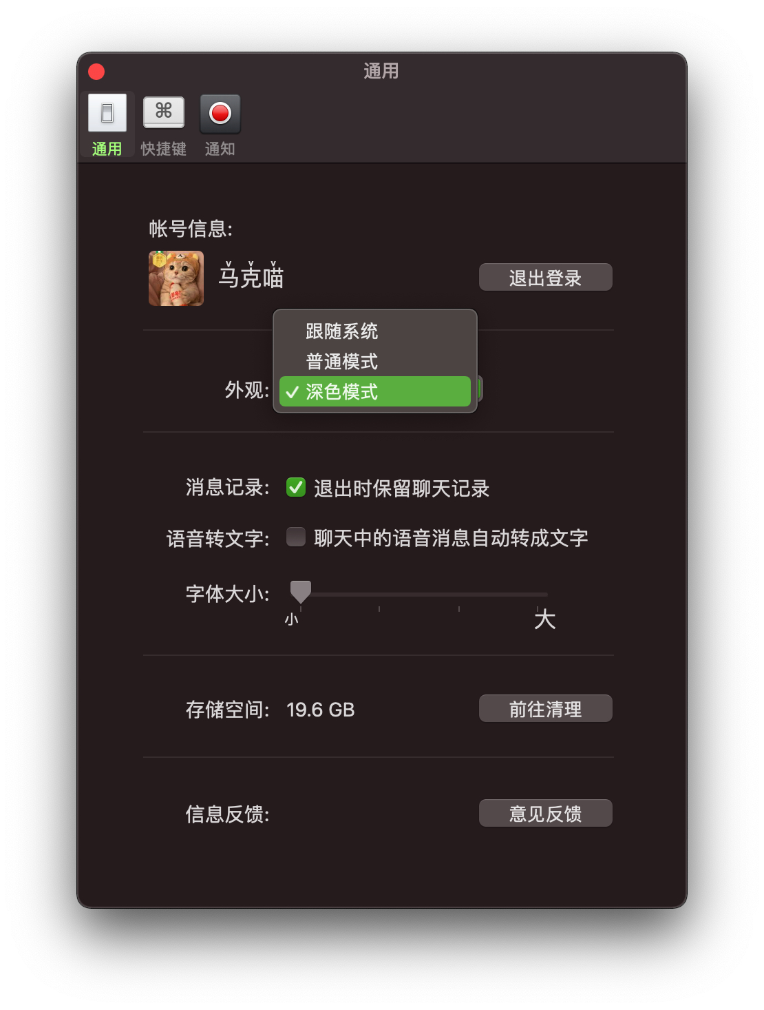 在微信的偏好设置中还可以对外观进行单独设置,有跟随系统、深色模式或浅色模式可选。