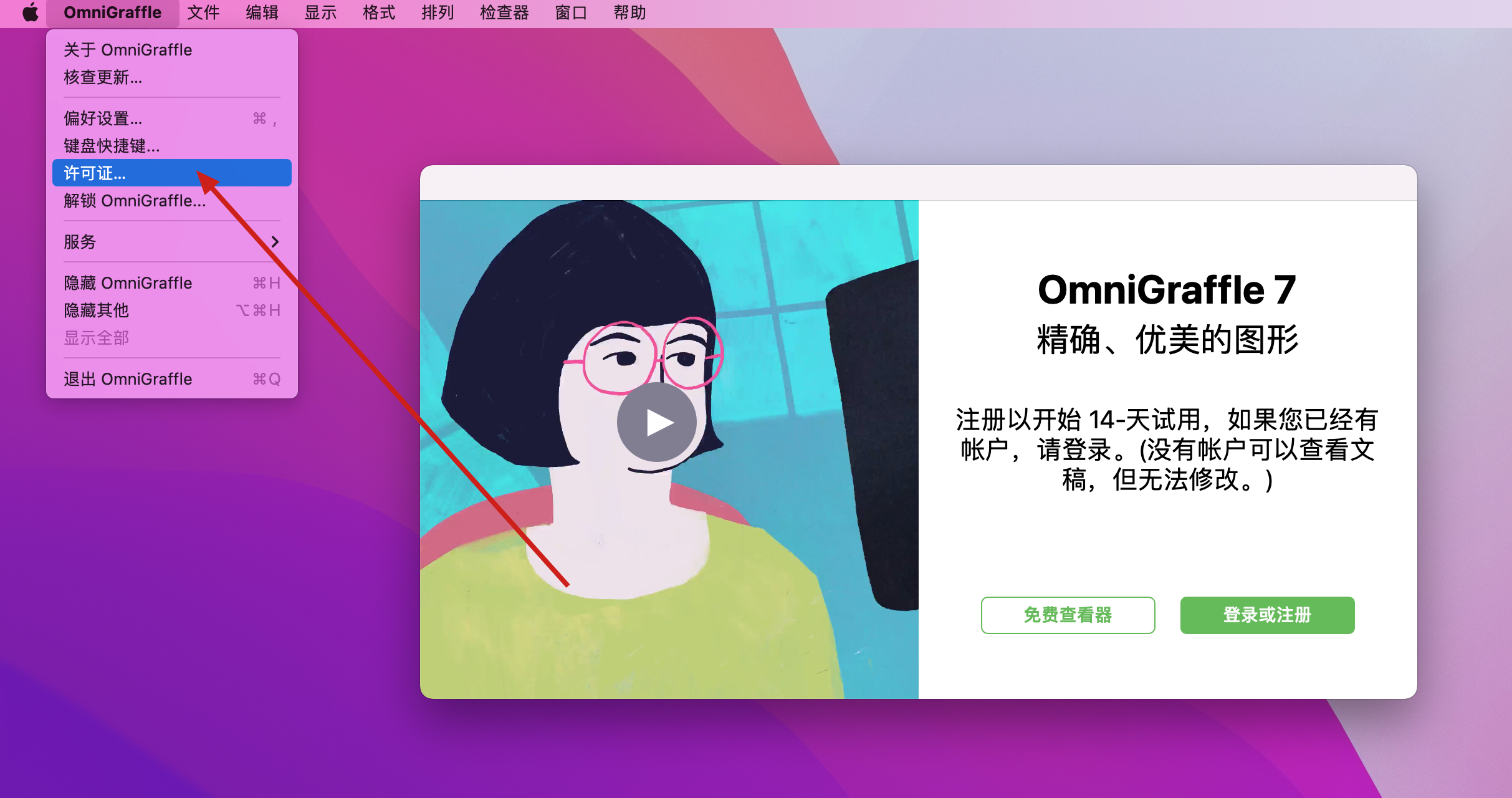 1.安装完成后打开,在OmniGraffle菜单栏选择许可证