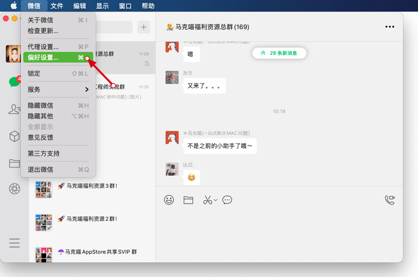 点电脑左上角-【微信】-【偏好设置】