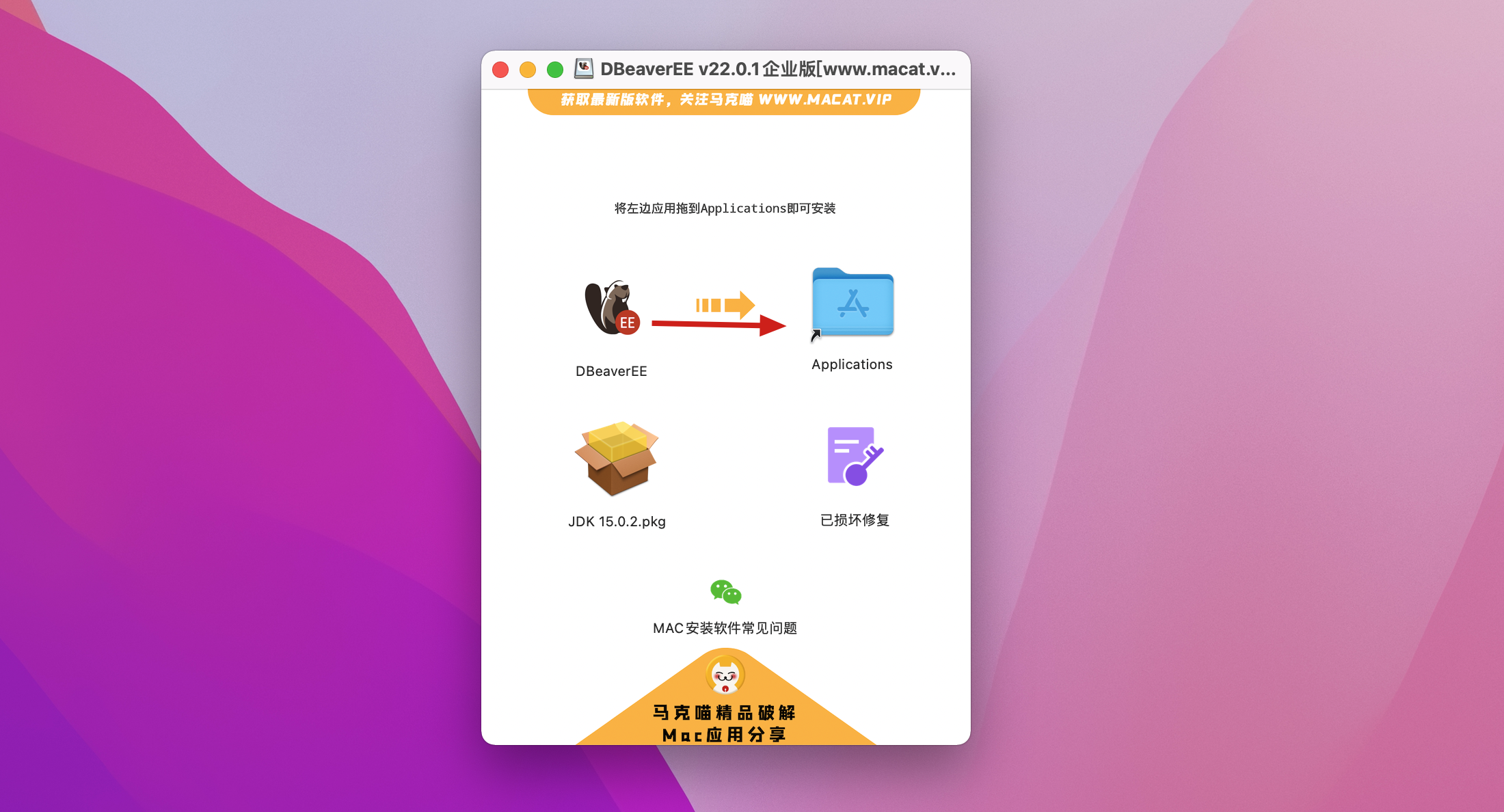 1.将左侧的DBeaverEE拖动到右侧的applications中即可,如图