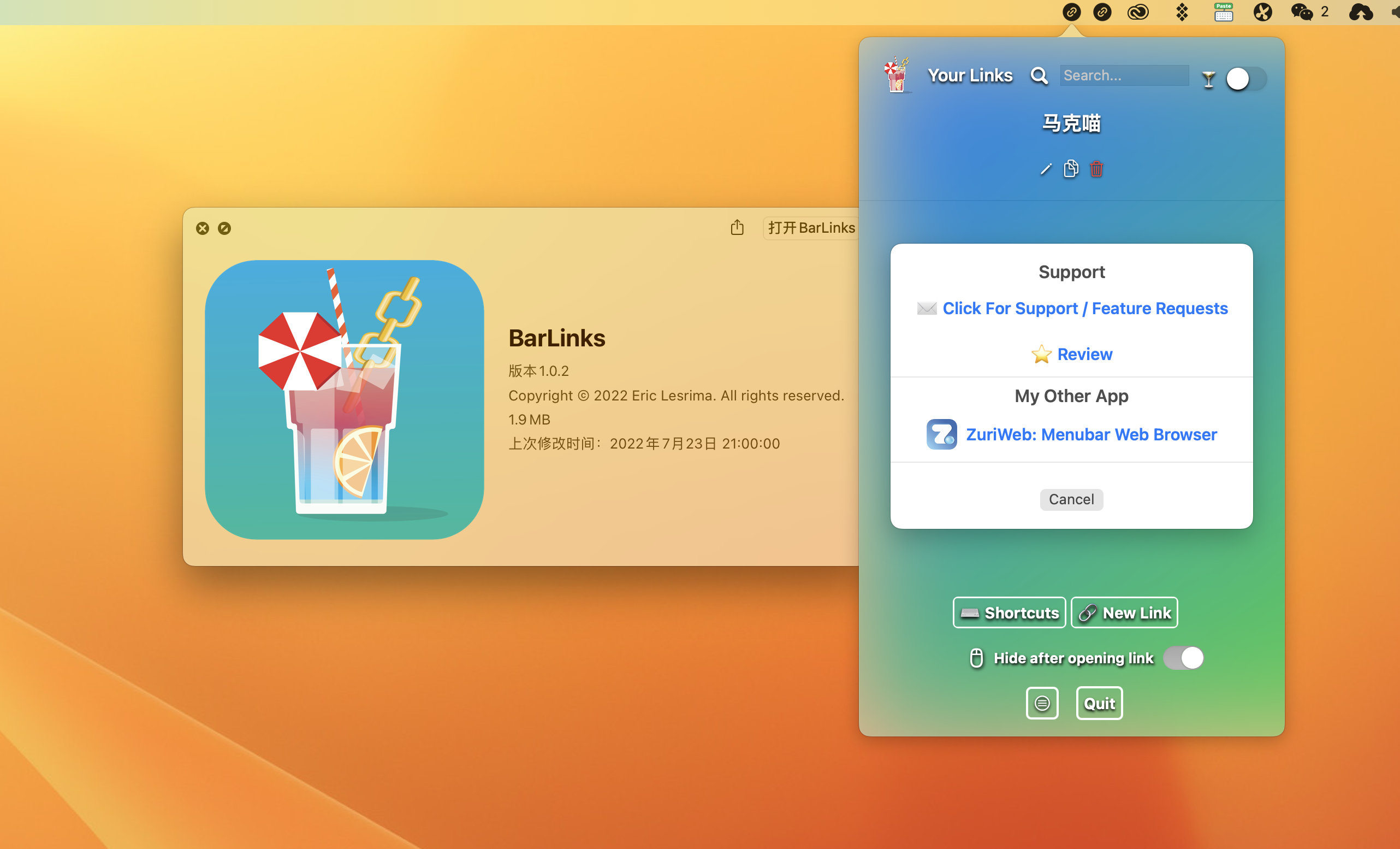 BarLinks 让您可以直接从菜单栏中存储、快速查找和打开书签。