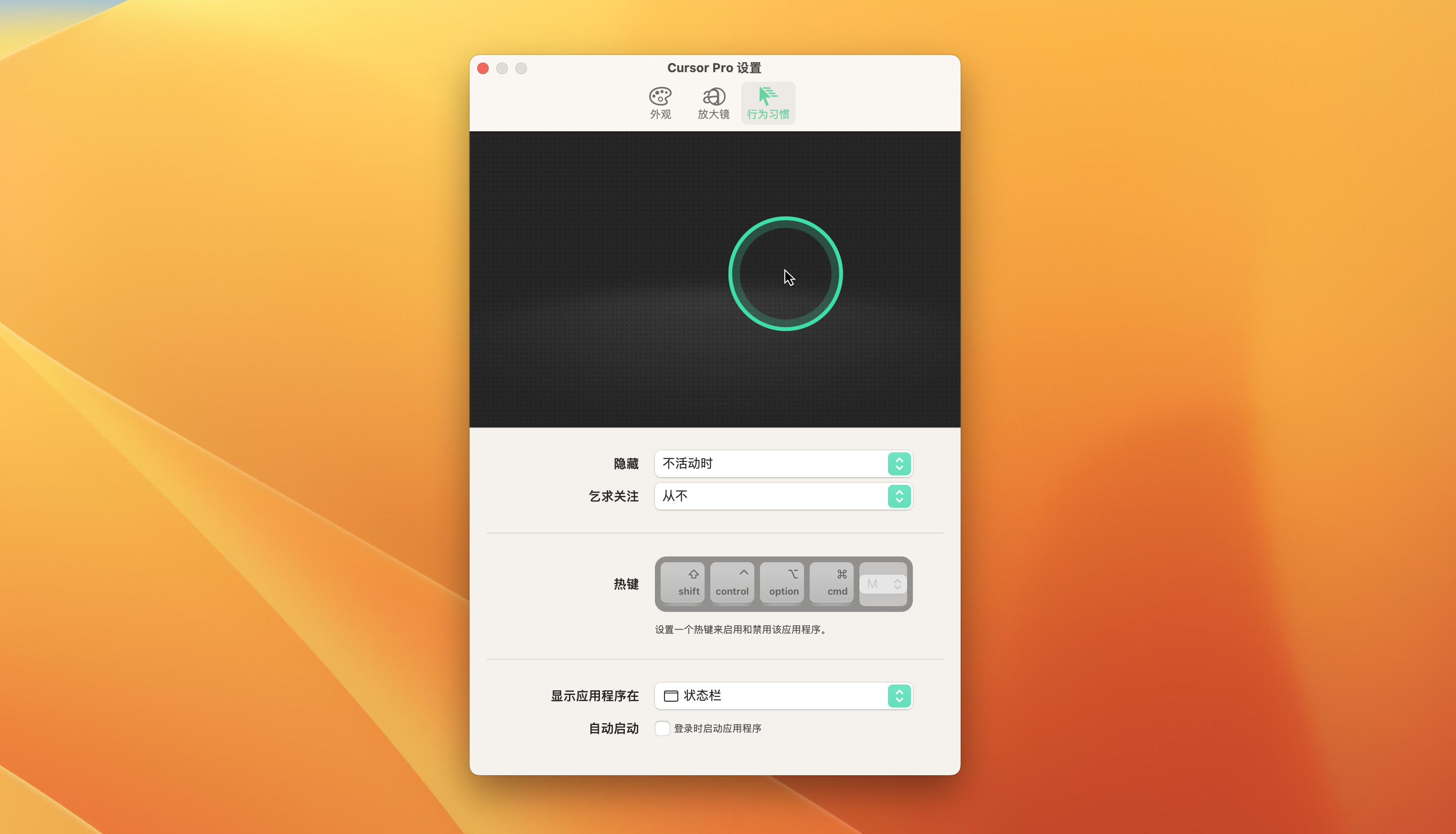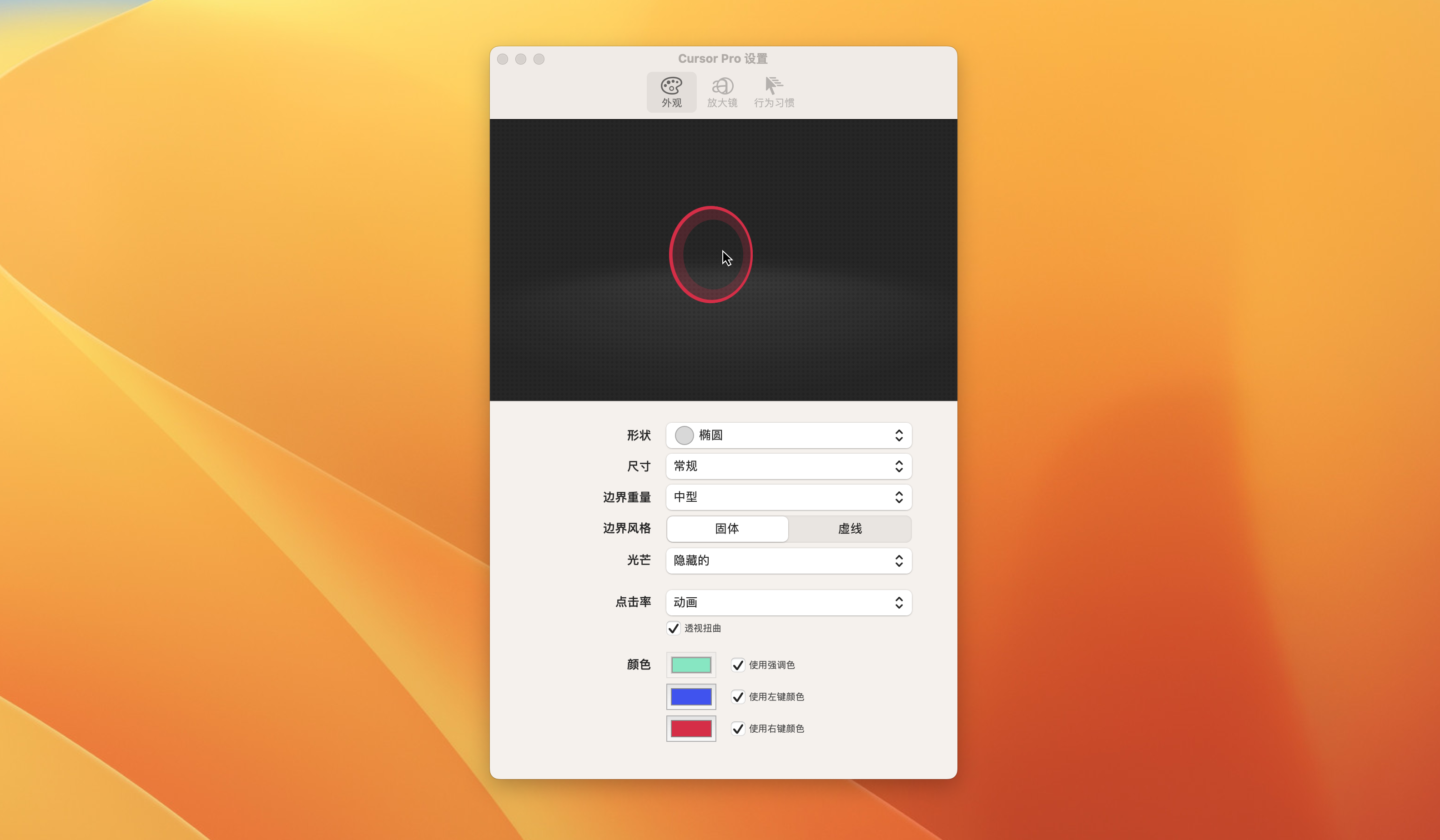 Cursor Pro Mac版可以让您像专业人员一样演示您的屏幕,能够突出显示您的鼠标指针,使用Cursor Pro,您可以将其用作放大镜,轻而易举的找到鼠标所在位置,所有这些都来自一个精心设计、使用有趣的应用程序,并且它是完全可定制的,选择您希望指针突出显示的方式,包括圆形、赏心悦目的松鼠和菱形菱形。