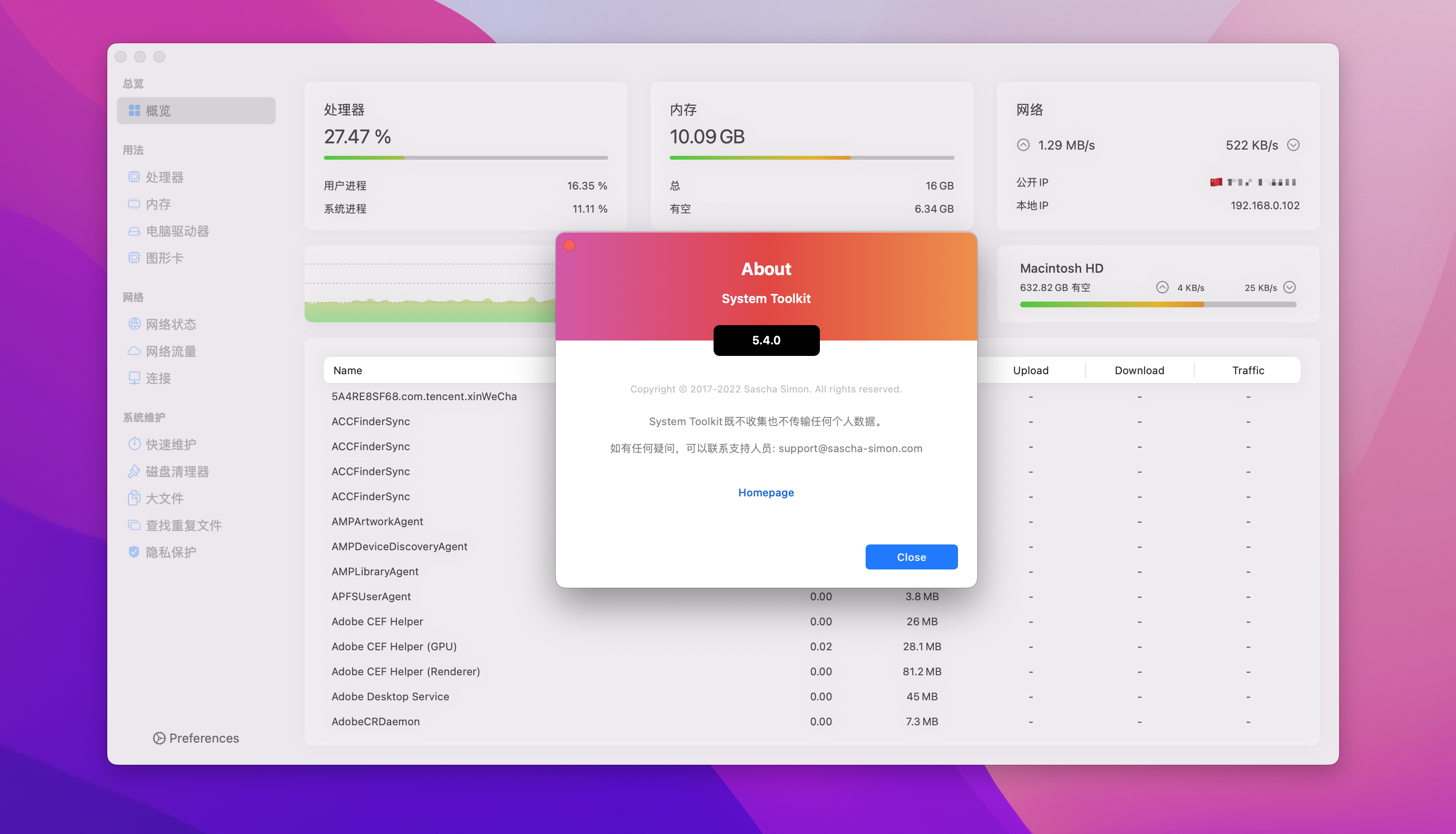 System Toolkit Mac破解版是专门为MacOS设计的一体化信息和维护应用程序,分享了系统维护、隐私保护、磁盘清理、电池维护、网络状态监控、网络流量监控等实用的功能,清晰的中文界面,让你操作更方便。