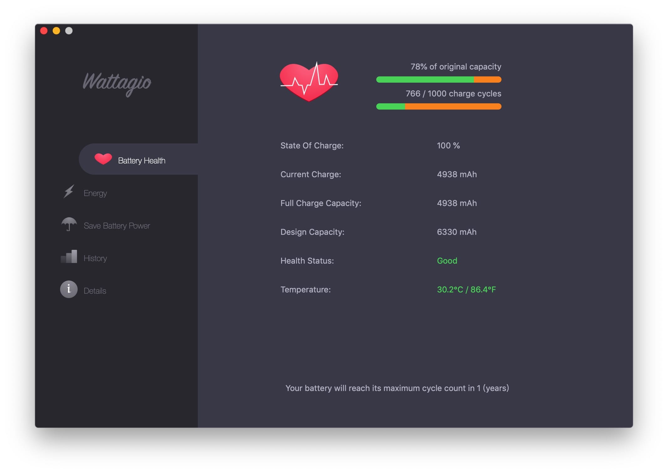 电池的生活故事。亮图将显示电池的自主工作时间,充电时间,完全充电电池时间。其他图表显示电池的使用情况统计数据以及有关一天,一周,一个月和一年中电池电量的数据。