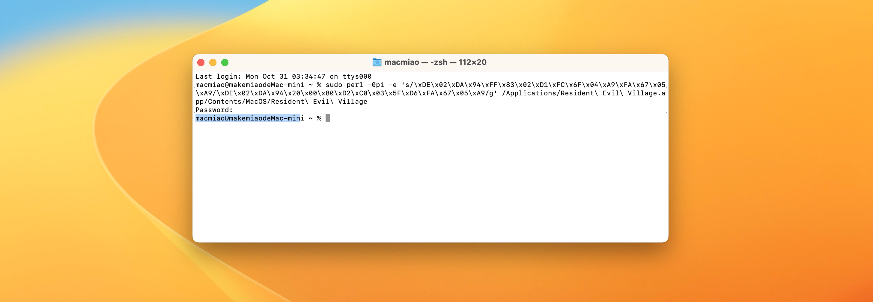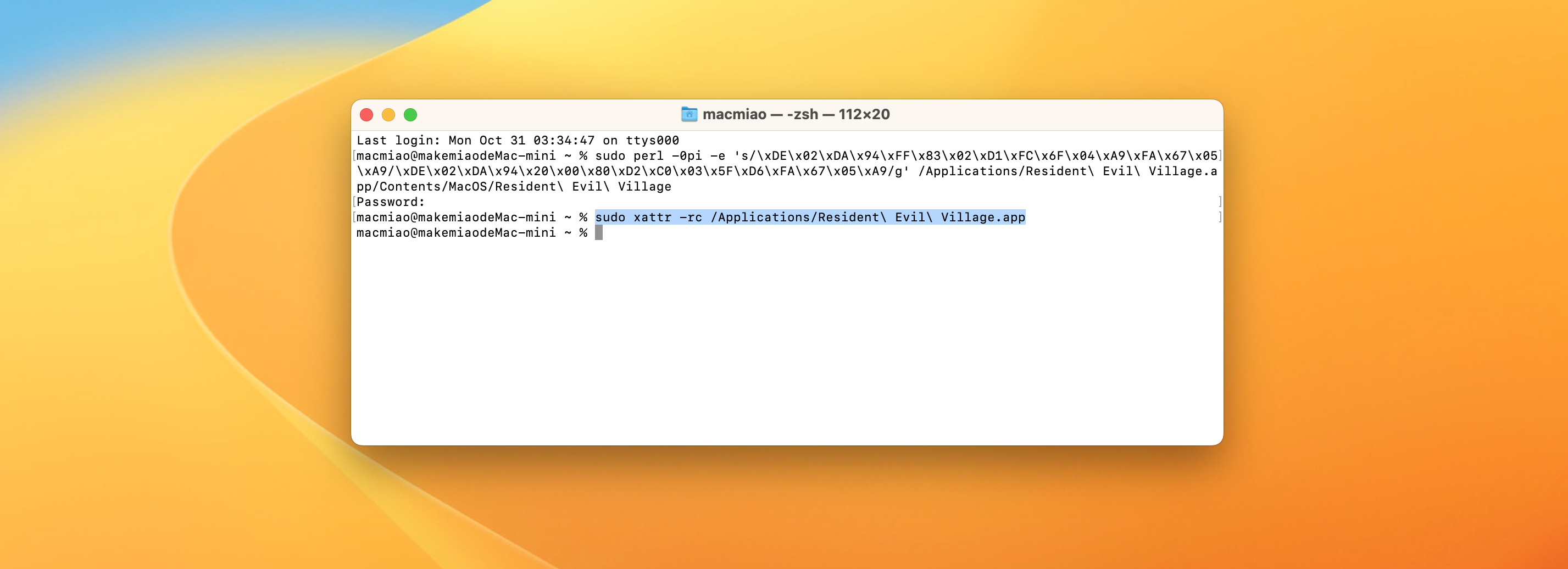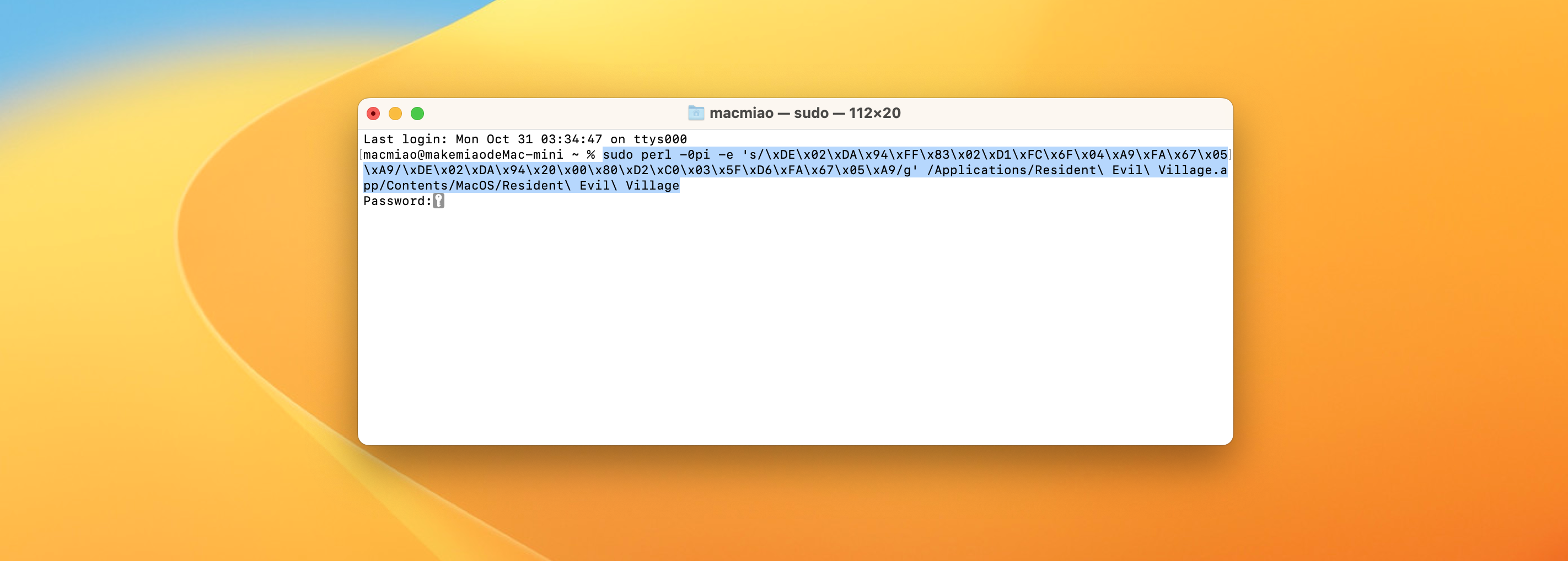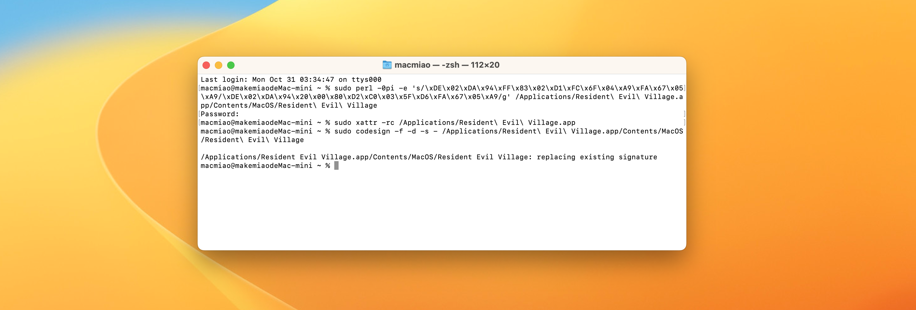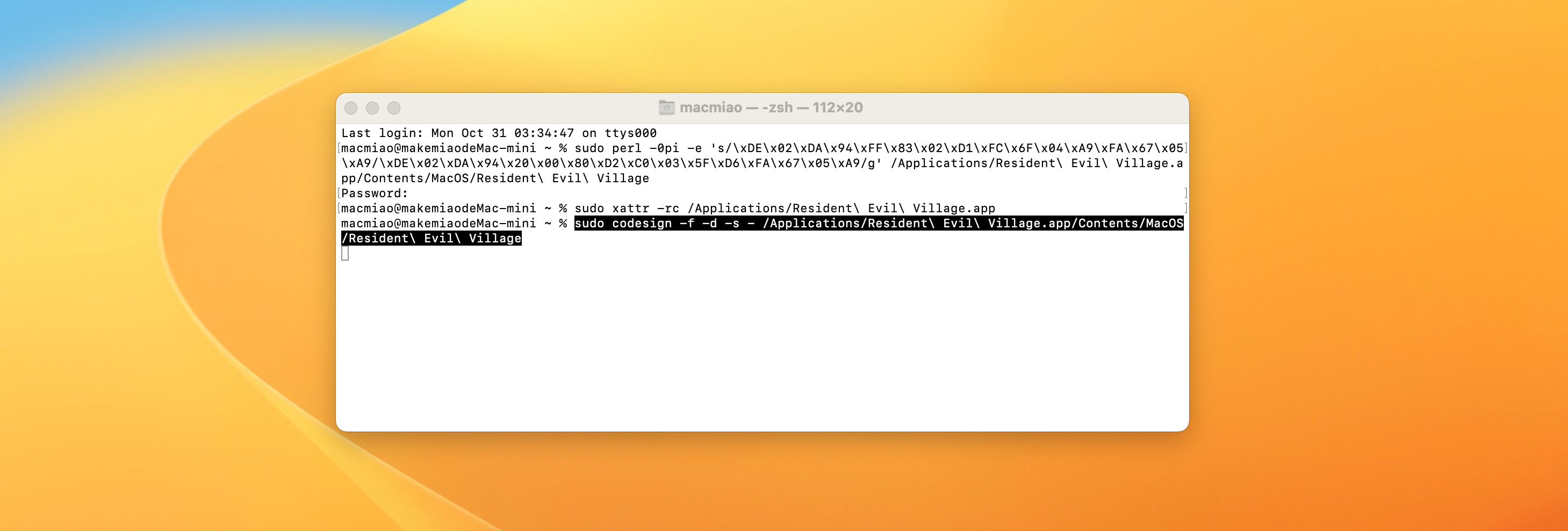 sudo codesign -f -d -s - /Applications/Resident\ Evil\ Village.app/Contents/MacOS/Resident\ Evil\ Village