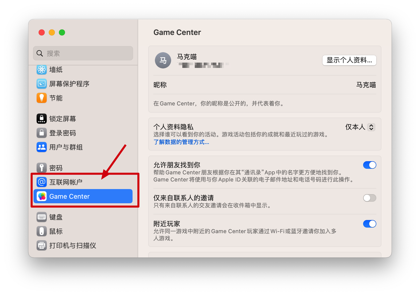 5.可以打开游戏了,如果你进入游戏后出现以下界面,是因为没有登录Apple ID,打开 系统设置 -> 互联网账户下方的Game Center 登录你的Apple ID,然后重新打开游戏就好了