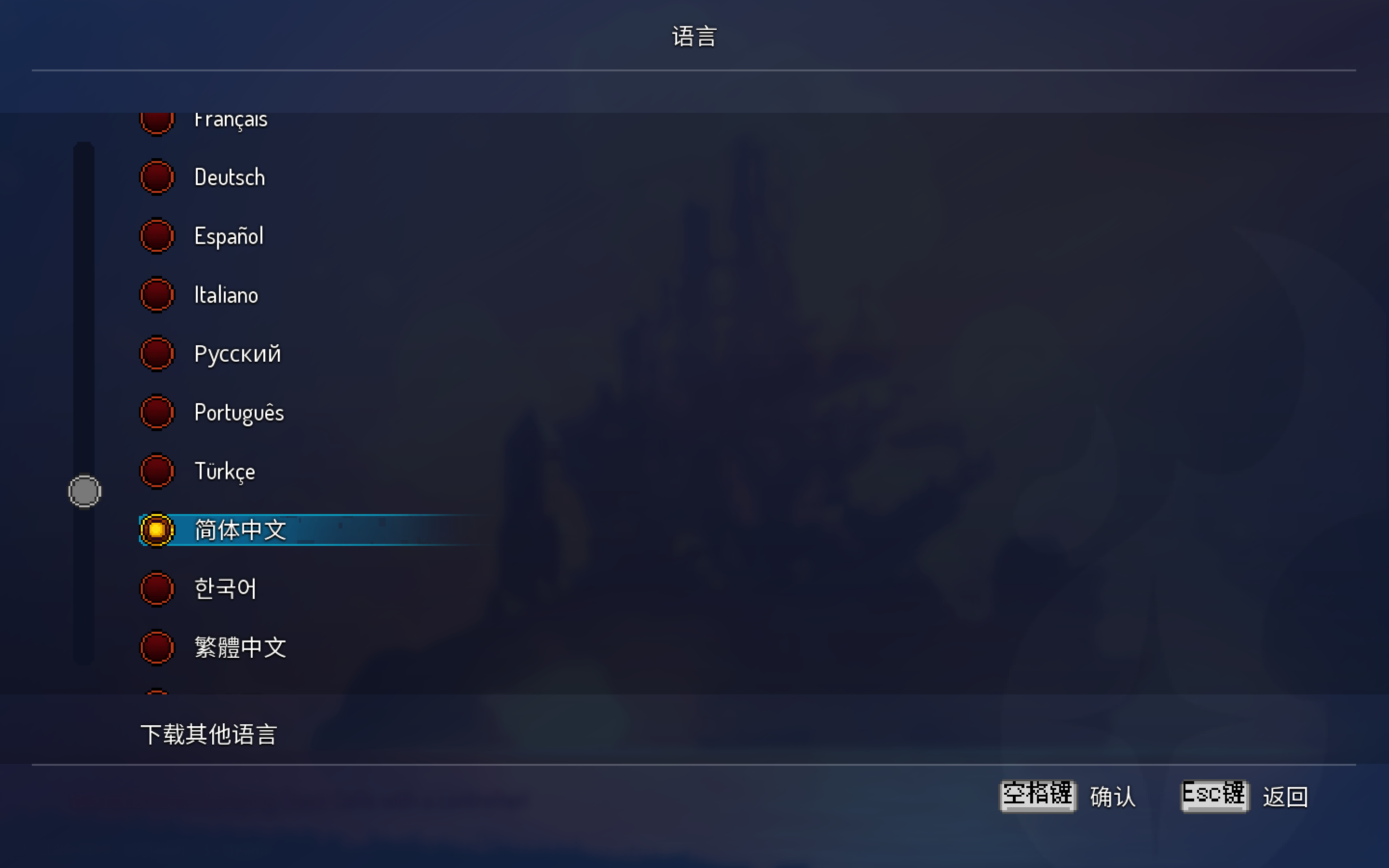 W:打开游戏死亡细胞,点击选项“Optios”-选择“language”-选择“简体中文”,完成。