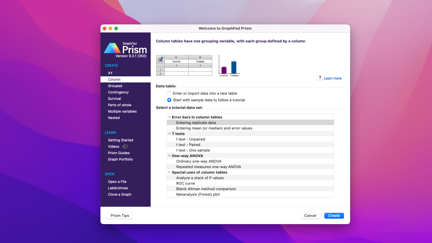 与电子表格或其他科学图形程序不同,prism有八种不同类型的数据表,专门为您要运行的分析而格式化。这样可以更轻松地正确输入数据,选择合适的分析并创建令人惊叹的图形。