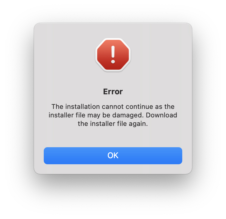 The installation cannot continue as the installer file may be damaged. Download the installer again.