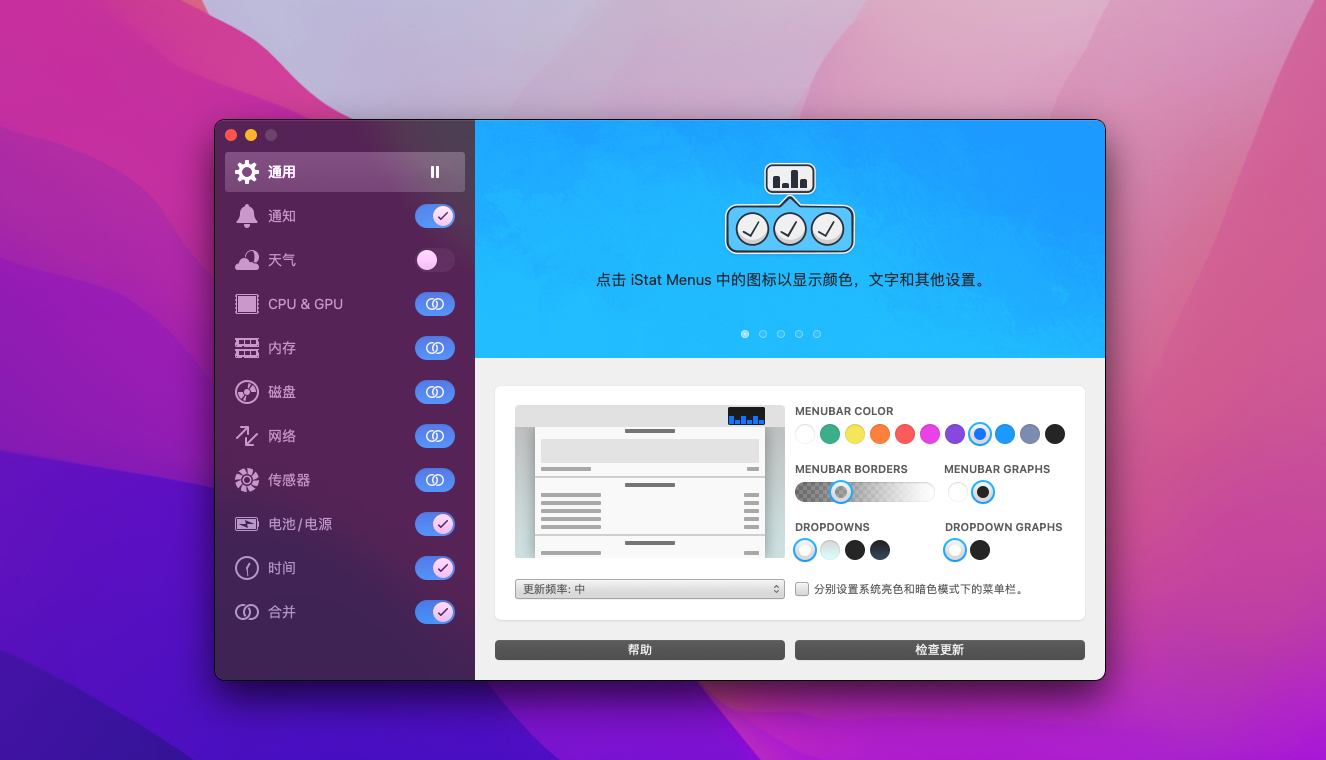 iStat Menus 中文破解版是一款位于macOS状态栏菜单的系统活动监控器,可以帮助您轻松监控系统活动和资源使用情况。您可以及时查看分析您的CPU和GPU,内存,磁盘,网络,传感器,电池或时间,别外还支持在mac的任务栏显示天气,iStat Menus 是用于监控系统状态的不二之选,装机必备,不容错过!