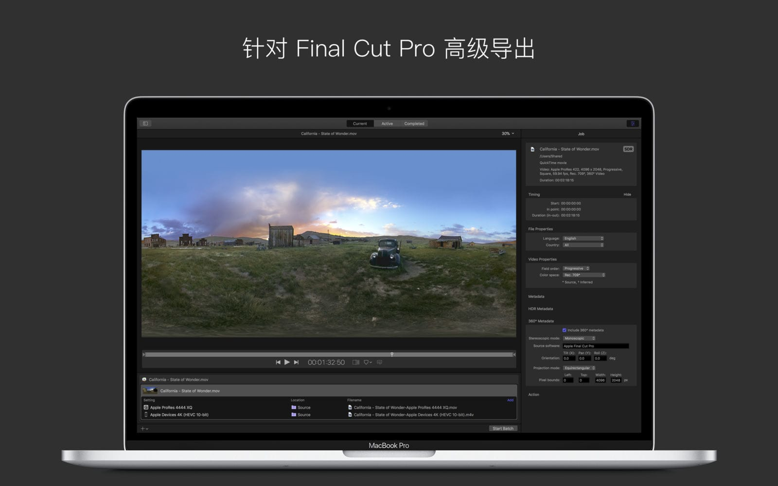 ・编码成各种符合行业标准的格式,包括 HEVC、MPEG-4、H.264、MXF 和 ProRes