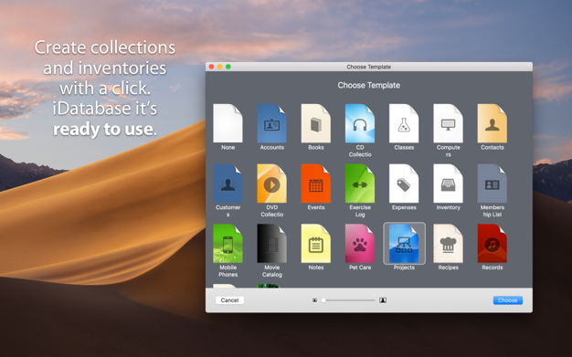 您可以选择22种随时可用的模板,并对其进行自定义以组织所有类型的信息:CD收藏品,DVD收藏品,光盘,我的帐户,课程,计算机,联系人,客户,活动,日记练习,费用,库存,电影目录,会员列表,移动电话,笔记,项目,食谱,待办事项,汽车维修,动物和书籍。