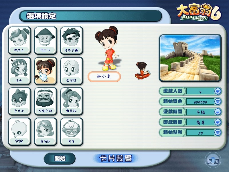 游戏中可选择的主要角色有钱夫人、忍太郎、阿土仔、孙小美、舞美拉、金贝贝、沙隆巴斯和乌咪等。另外,该作新增变身系统,能够把角色变成不同样子的神明。例如,控制的忍太郎使用金刚卡,那么忍太郎就会变成一头威猛的大金刚。只要进入对手的房屋,大金刚发威一律拆无赦,同时还可以变成其它状态,例如福神、流氓、超人、财神、福神、穷神、衰神、超人、警察、糊涂鬼、流氓、大金刚、小猪等。