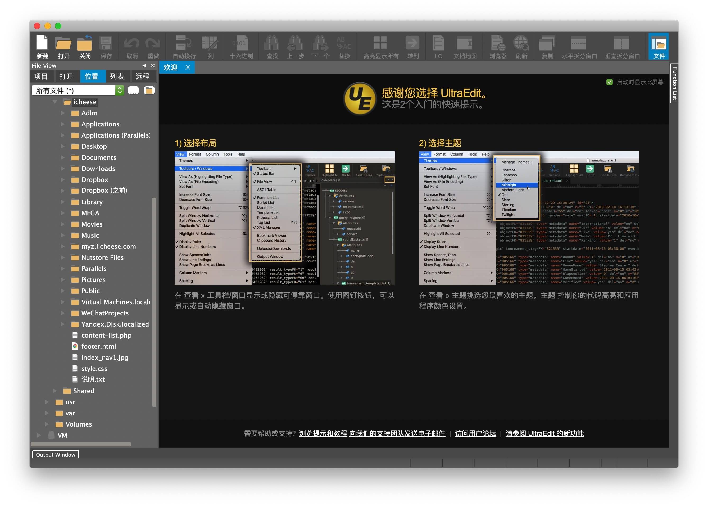 UE Mac 分享了大量的工具,非常适合从基本的文本编辑,到 C,Objective C,Javascript,XML,PHP,Perl,Python 等语言的全面开发。