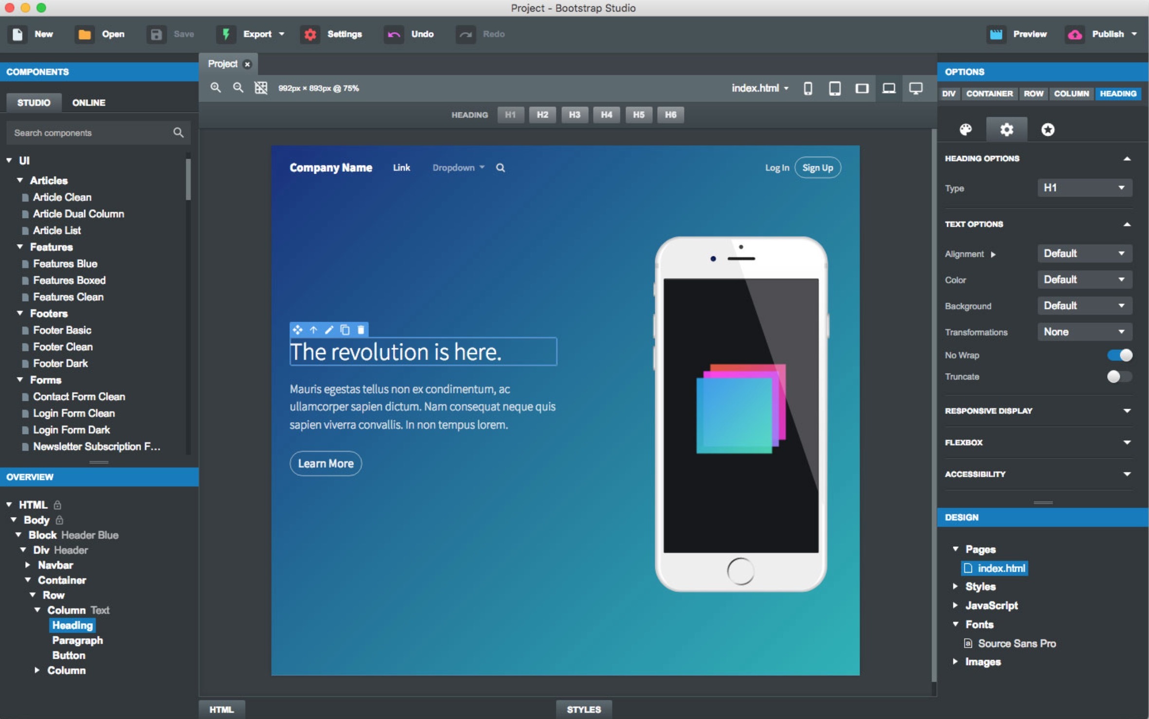 Bootstrap Studio拥有一个美丽而强大的界面,它以简单的拖放操作为基础构建而成。这使其成为原型和设计网页和应用程序的理想工具。