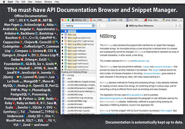 Dash是一个API文档浏览器( API Documentation Browser),以及代码片段管理工具(Code Snippet Manager)。它就只有这两个功能,但确实是程序员最为关心的特性,可以毫不夸张地说,Dash是它们之中做的最好的一个!非常实用。从它第一版发布用到现在,绝对是一个你值得拥有的文档管理工具.