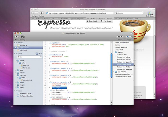 极其强大的编辑,圆滑的项目,实时预览,真正的部分和广泛的同步工具功能,还有惊人的可扩展能力,Espresso支持code folding,还能以dom方式呈现,另外Espresso支持外挂,也就是说可以自己建立需要的语法,还支持正则表达式,这点不错。
