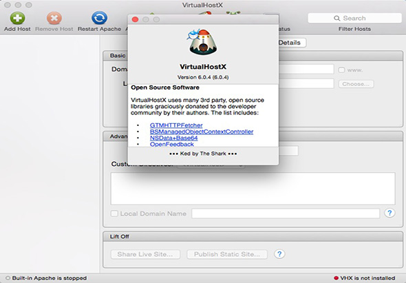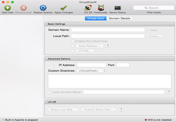VirtualHostX(VHX)是搜集到的一款网站虚拟服务器架设工具,我们利用它可以轻松架设并管理本地的网站项目,VHX默认支持Mac内置Apache ,MAMP,XAMPP,ZEND S CE四种环境的Web Server,支持自定义Web Server,同时VHS还分享特殊服务:“LiftOff”,开启LiftOff后软件自动为本地网站建立一个域名,供他人在公网访问你的“本地网站”。
