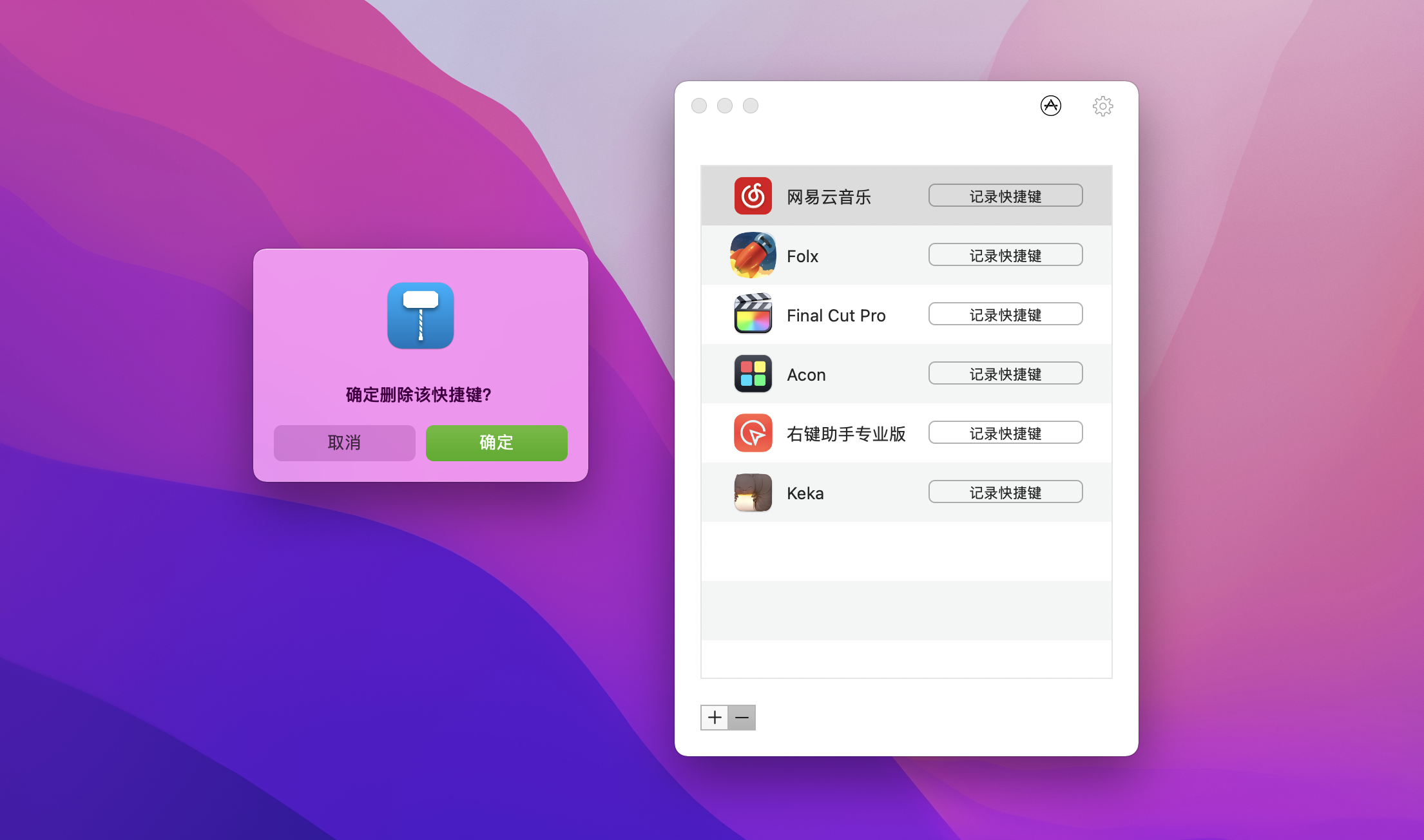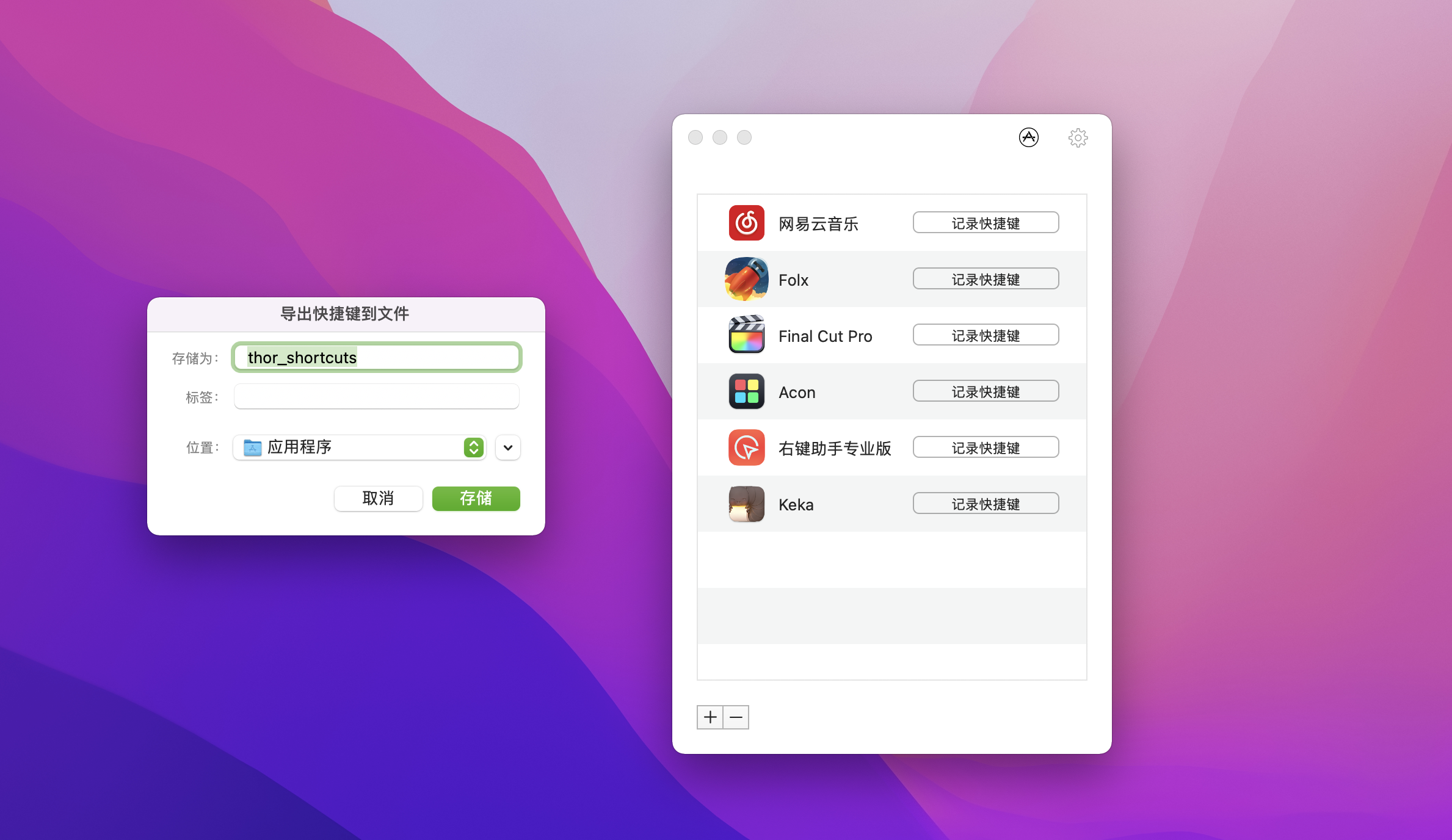 Thor 的使用非常简单,界面也很简洁,并且已经适配 macOS Mojave 暗黑模式。安装软件后,打开它,点击菜单栏中的图标 – 设置快捷键,点击左下角的加号,添加应用程序文件夹中的 App,并对其设置快捷键即可。