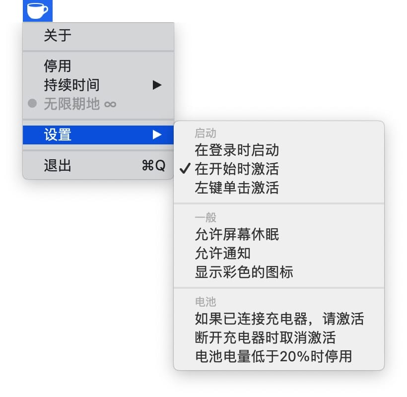 - 可通过菜单栏中的咖啡杯图标进行管理