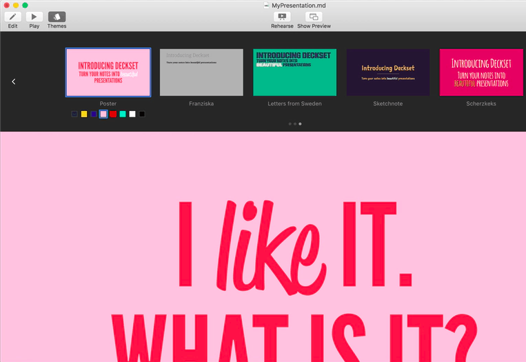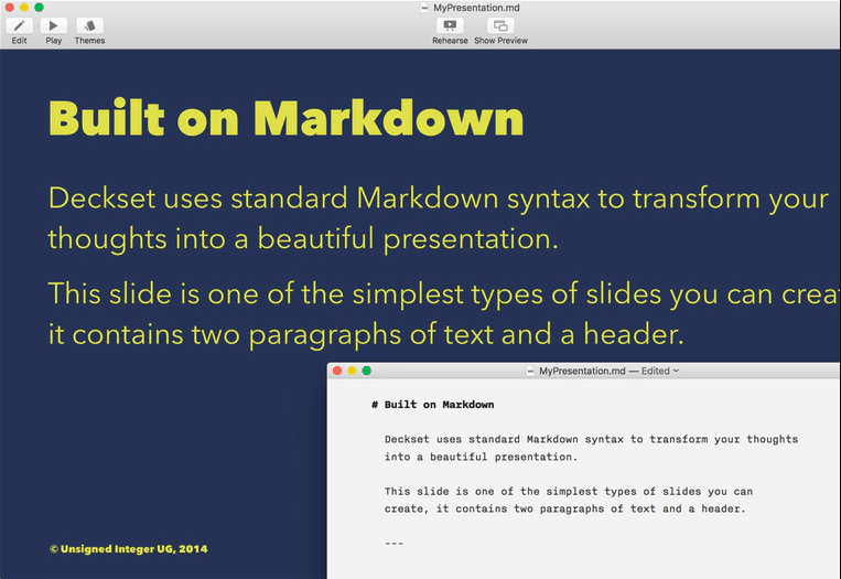 将您的演示文稿写成文本文档,在Deckset中打开并呈现。即使在展示的几分钟前,也可以随时更改并添加幻灯片。