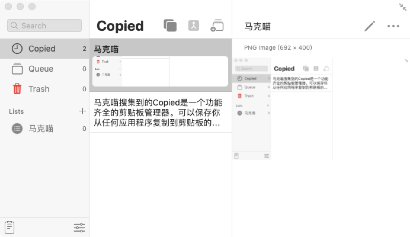 搜集到的Copied是一个功能齐全的剪贴板管理器。可以保存你从任何应用程序复制到剪贴板的文本、链接和图像。
