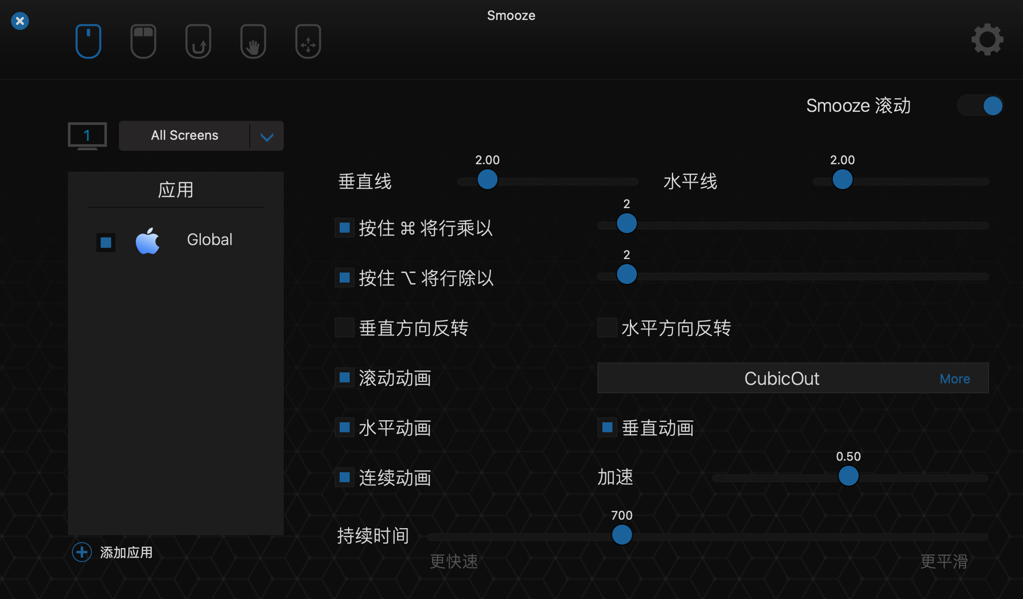 搜集到的Smooze 是一款Mac鼠标平滑滚动神器,可以设置鼠标的横向(水平)以及竖向(垂直)动画,可以设置动画的时间,动画的效果以及滚动的步长。您还可以针对应用单独设置鼠标的滚动效果!