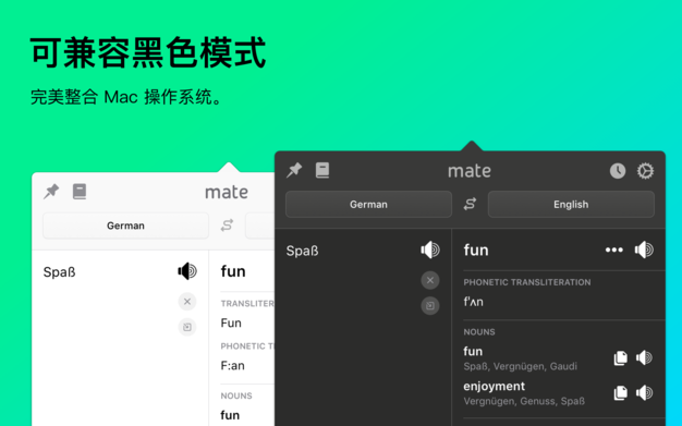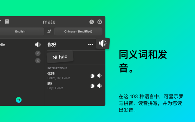 Mate Translate 可以在你的所有设备之间轻松同步,并且直接通过你的Mac菜单栏访问和使用。Mate Translate是即时文本到文本翻译的最好的翻译应用。