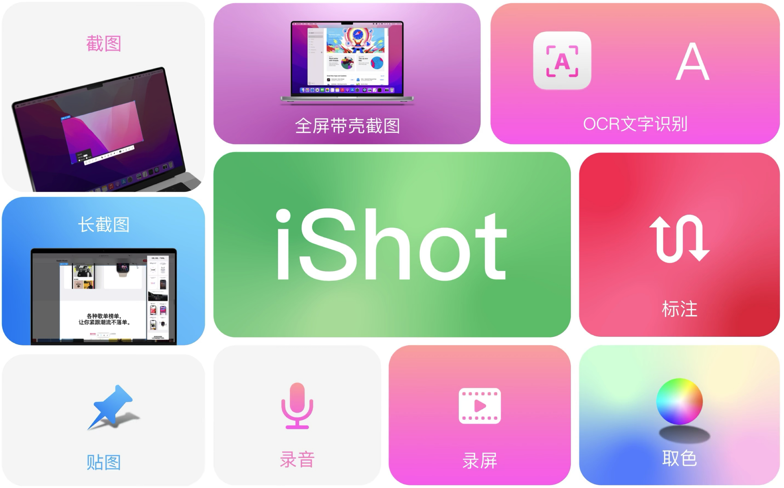 iShot是搜集到的Mac上一款优秀、功能全面的区域截图、窗口截图、多窗口截图、长截图、带壳截图、延时截图、快速标注、贴图、取色、屏幕录制、录音、OCR工具。