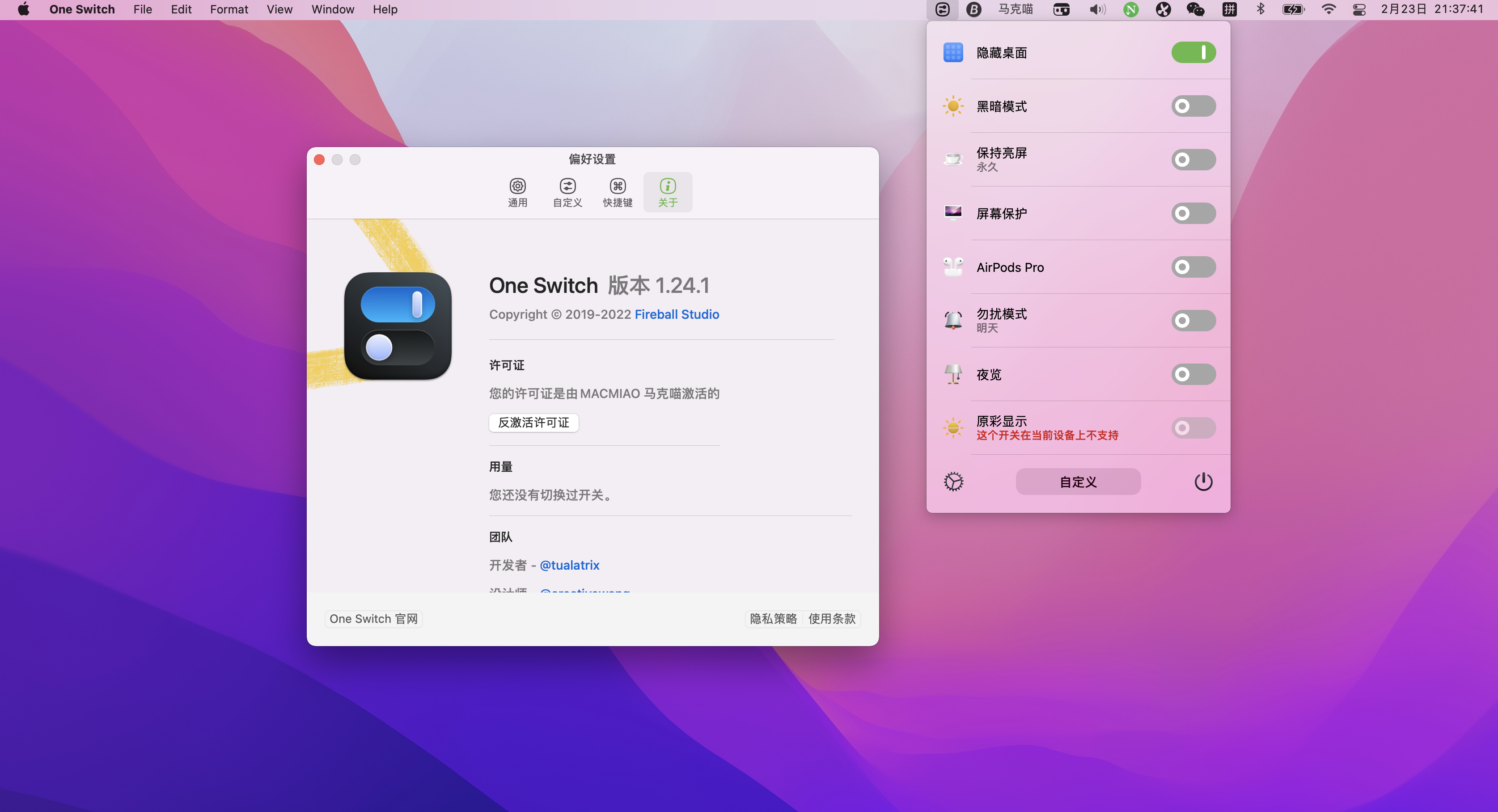 One Switch for Mac是一款功能集合软件,它可以帮你一键隐藏桌面、切换 Dark Mode、保持亮屏、开启屏保,连接Airpods。
