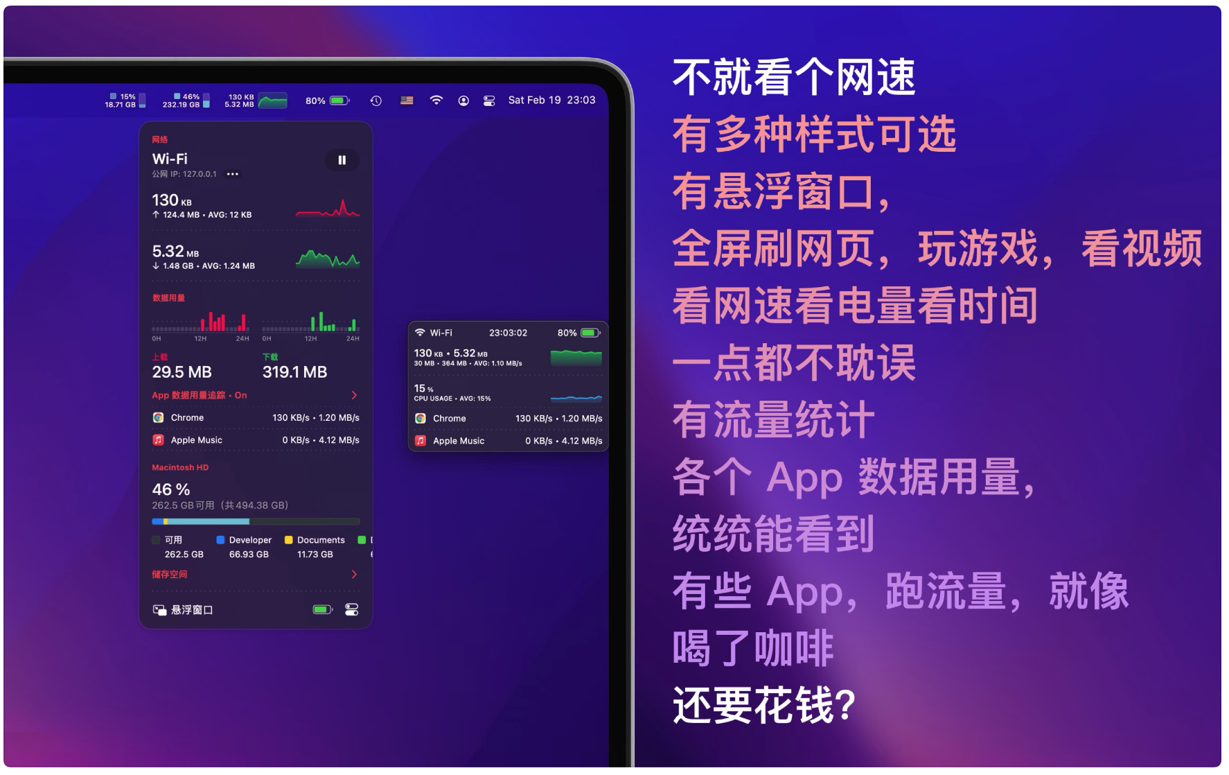 悬浮窗口:在任何桌面都可以看到网络速度和 CPU 使用量。