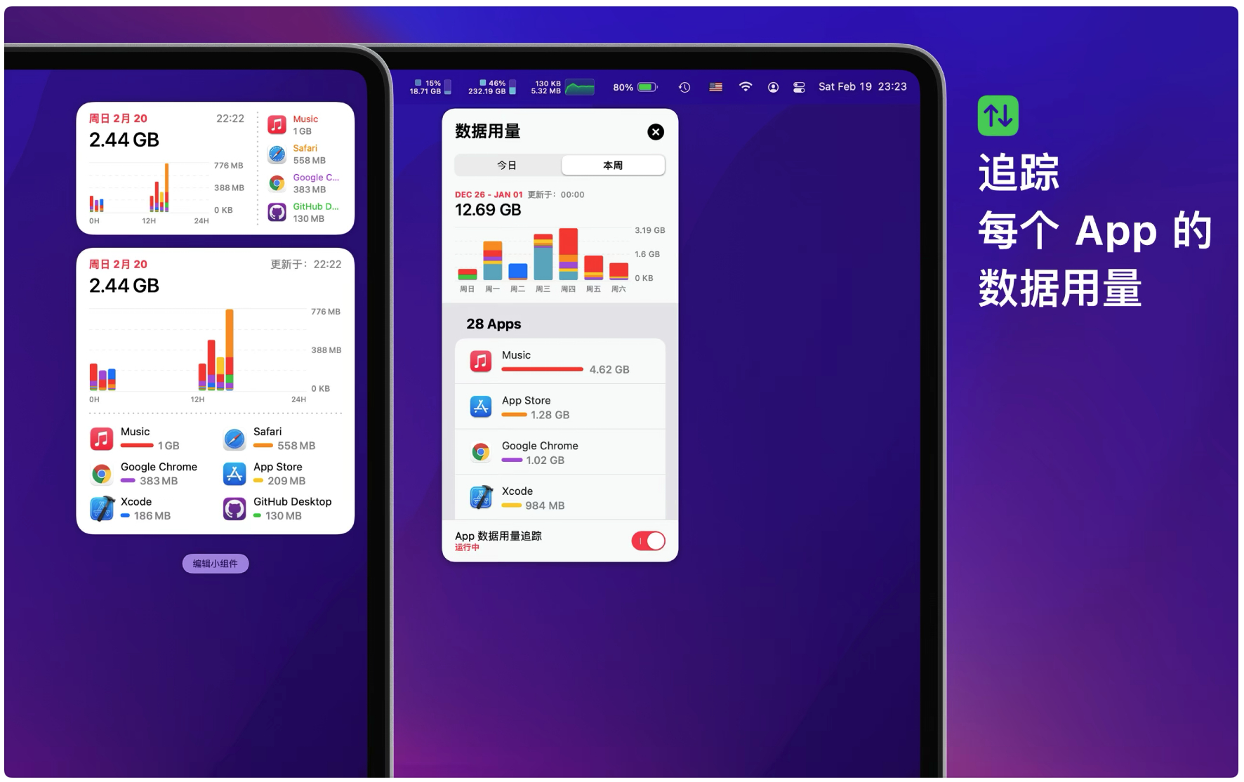 Network & Battery「网速 & 电池」是搜集到的一款简约的网络小工具,它挂在你的状态栏上,能实时显示你的 Mac 网络状态、上传下载速度、数据使用量、CPU 占用率和电池详情。此应用还支持悬浮窗口,悬浮窗口可以在任何桌面显示实时的网络上/下载速度和数据使用量、CPU 占用率和电池用量。支持今日小组件,你可以快速在通知中心查看网络速度和电池详情。随时了解你的电池健康和状态:电量百分比、容量、可用时长、循环次数、健康程度、温度和电量图等。通过及时掌握你的 Mac 电池状况,从而延长使用寿命。