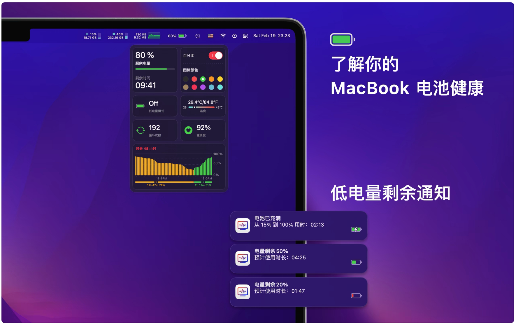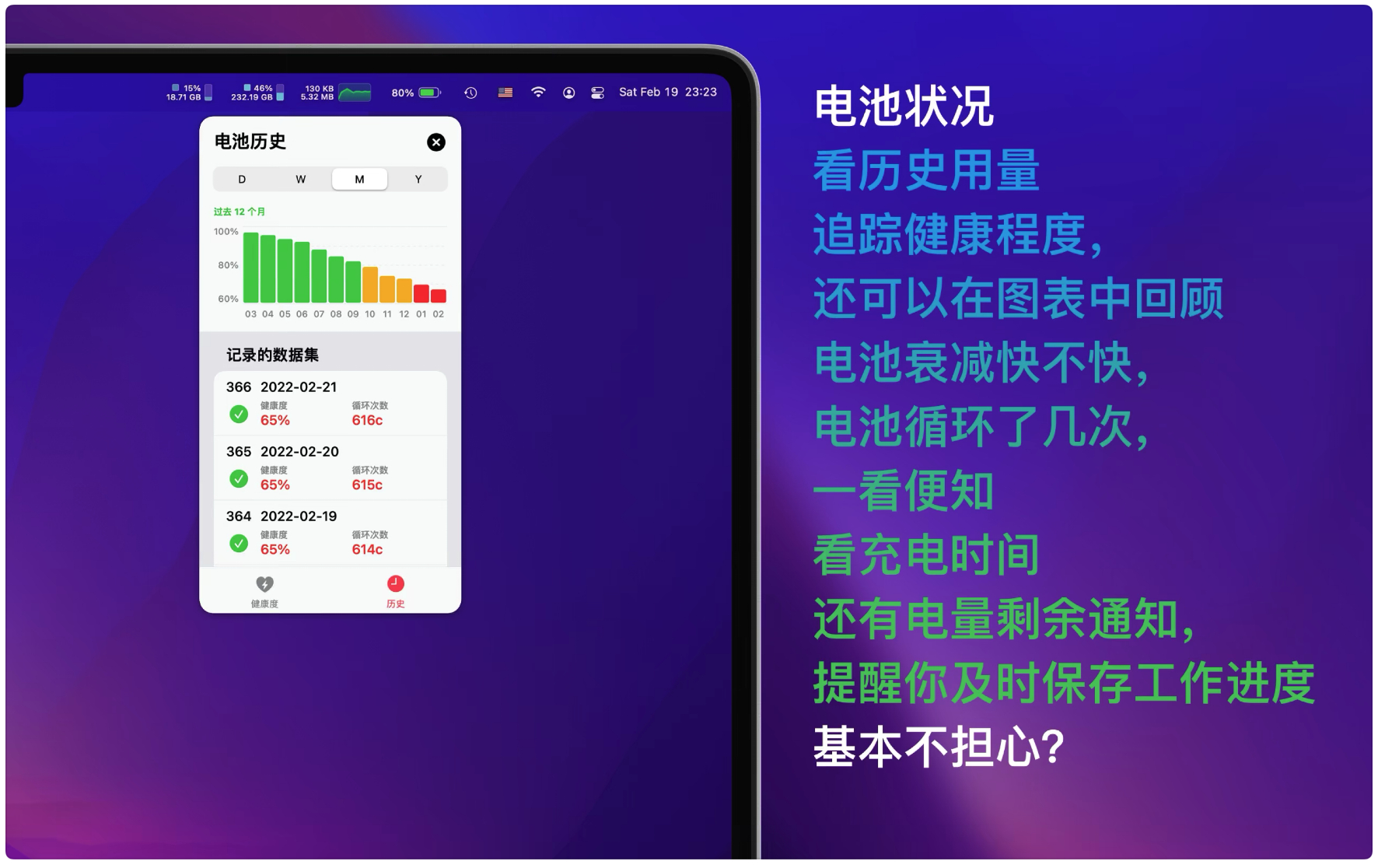 电池健康:了解你的 MacBook 的电池健康和状态,通过及时掌握你的 Mac 电池状况,从而延长使用寿命。