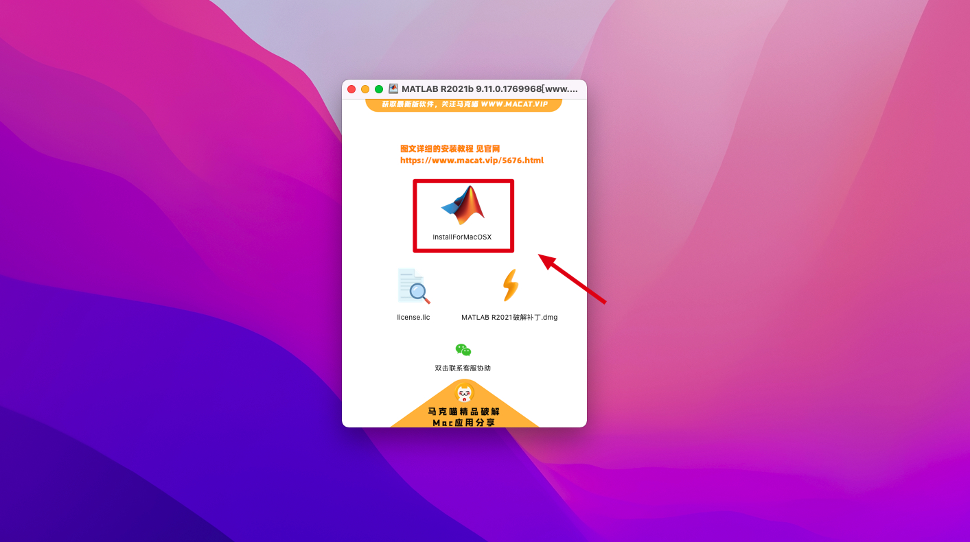 1.matlab r2021 mac破解版镜像包下载完成后打开,双击InstallForMacOSX进行安装。