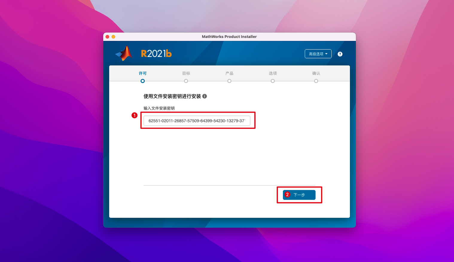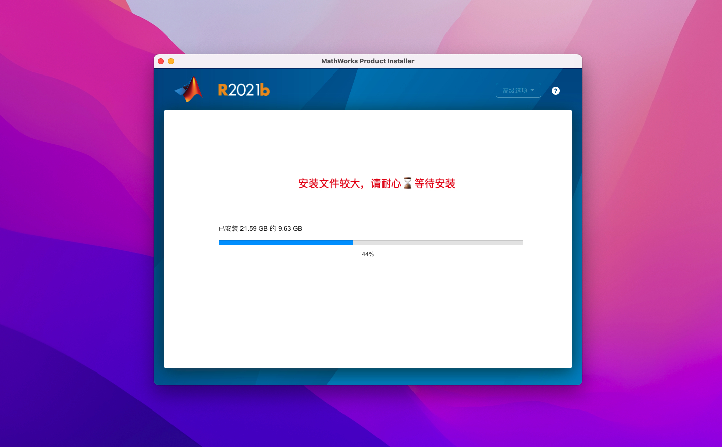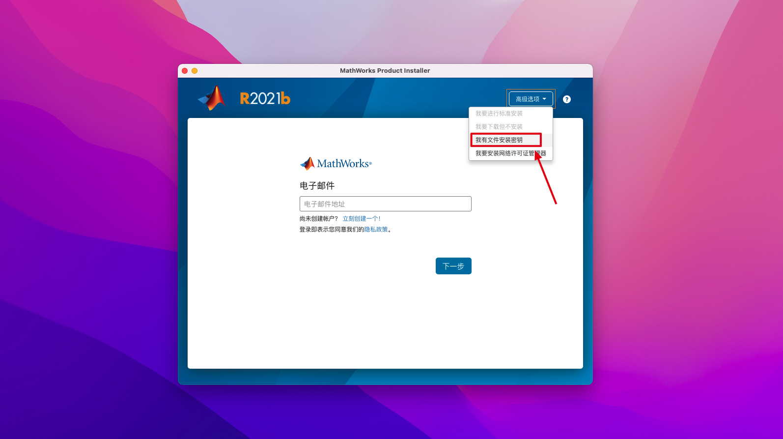 2.弹出一个MATLAB R2021安装程序,在高级选项里选择我有文件安装密钥