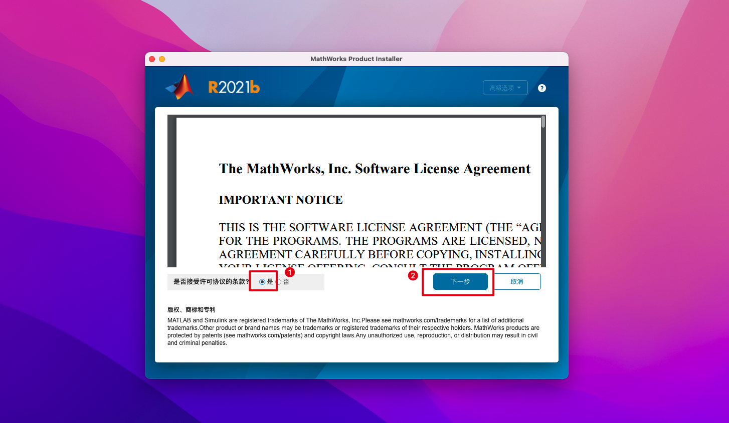 3.出现协议条款,那就选择是,同意MATLAB R2020b 协议,点击下一步