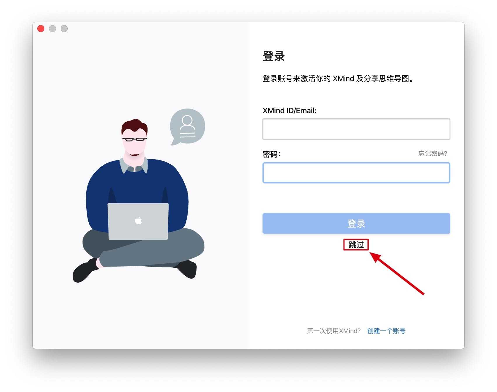 运行后出现登录弹口的时候点击跳过,千万不要登录!
